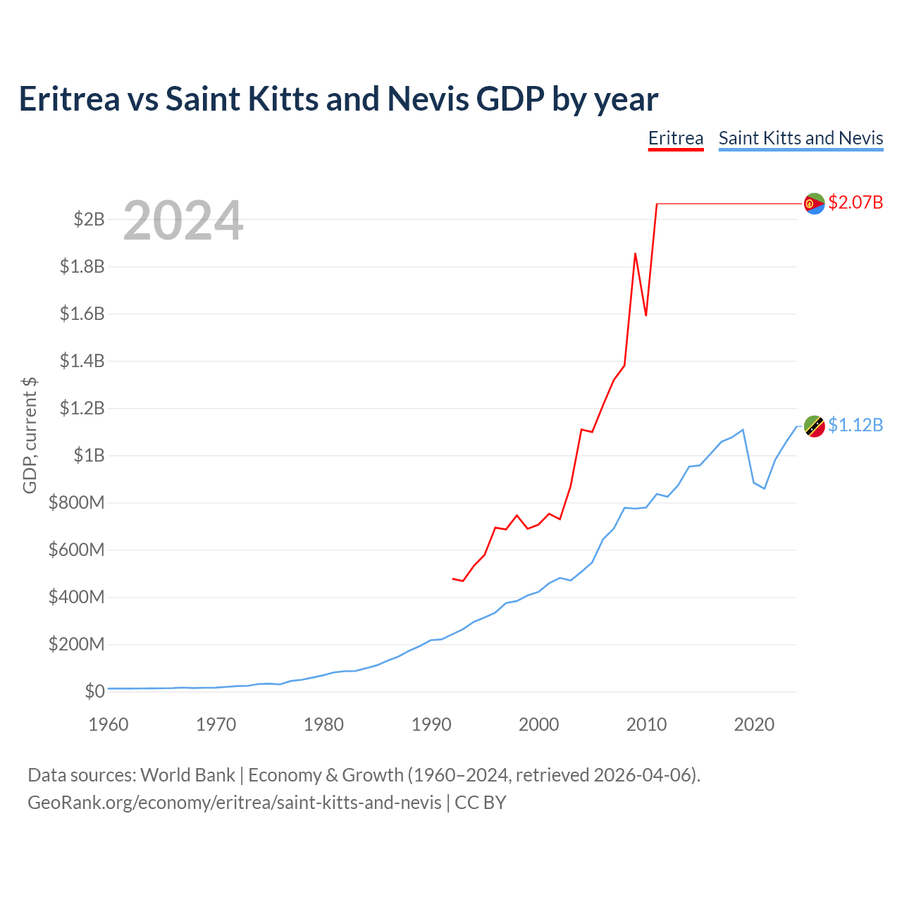 Eritrea has a GDP of $2.07B compared to $1.12B for Saint Kitts and Nevis, ranking 179/197 and 187/197 by economy size, respectively.
