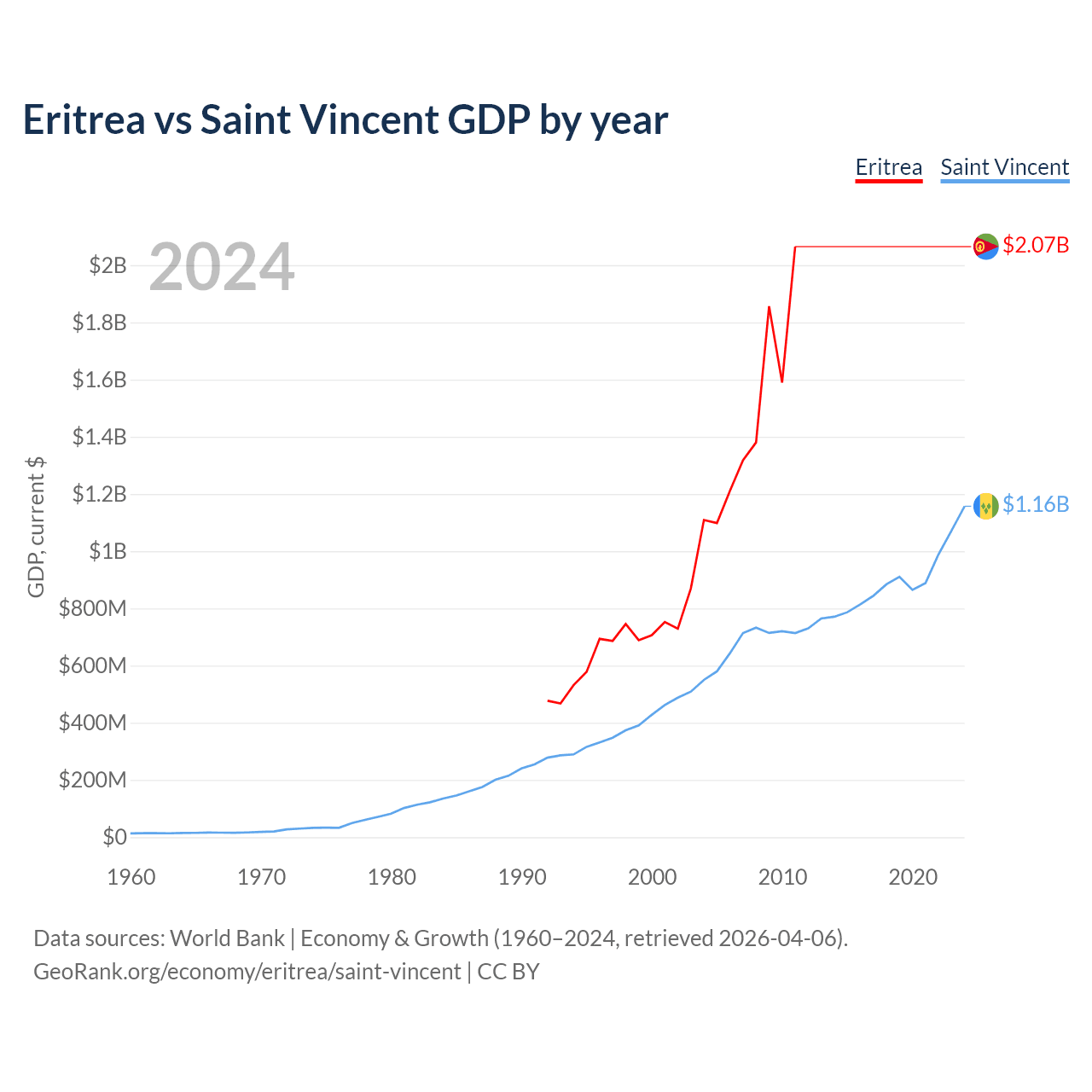 Eritrea has a GDP of $2.07B compared to $1.16B for Saint Vincent, ranking 179/197 and 186/197 by economy size, respectively.