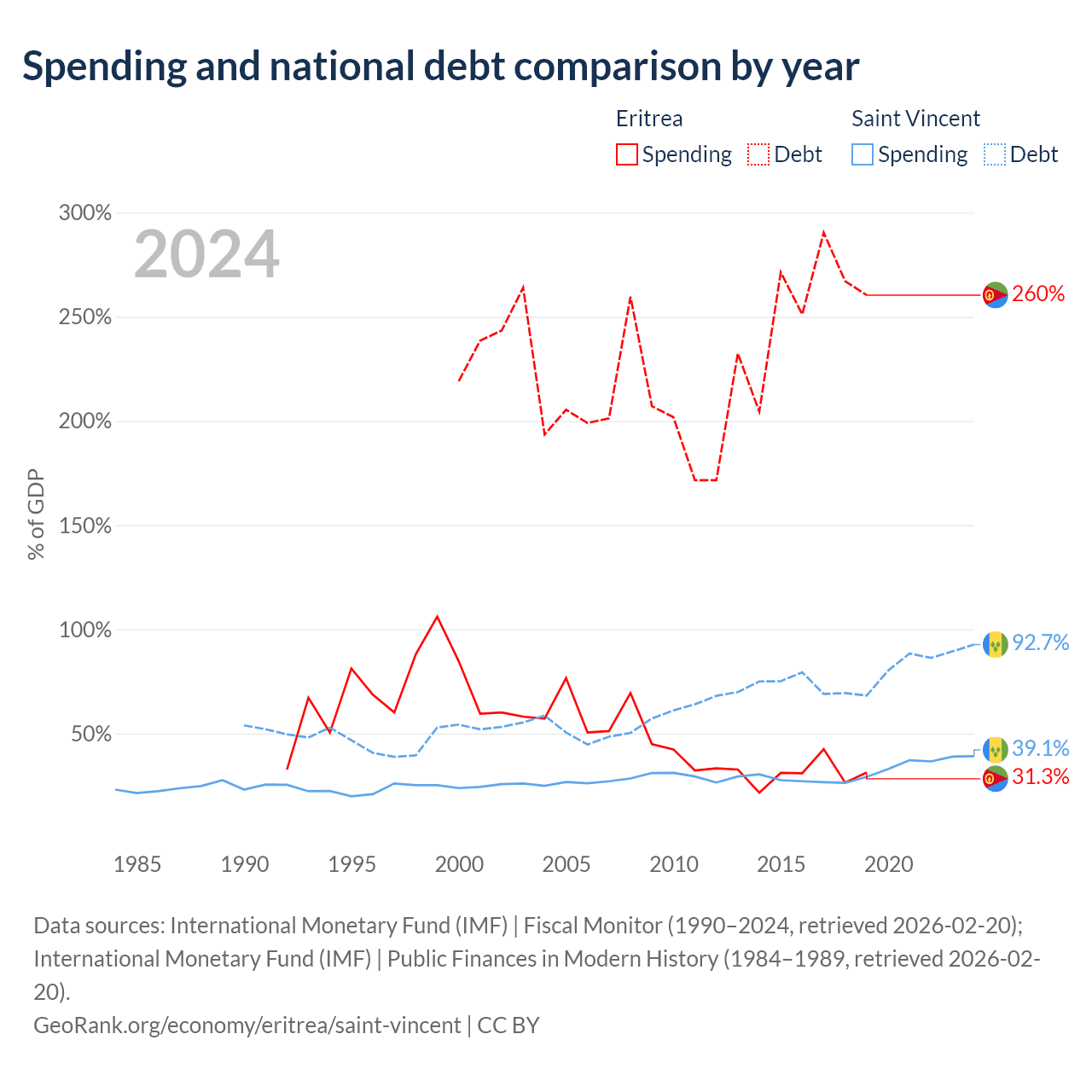 Eritrea has $3.54B in government debt (260.4% of GDP), compared to $1.07B (92.7% of GDP) in Saint Vincent.
