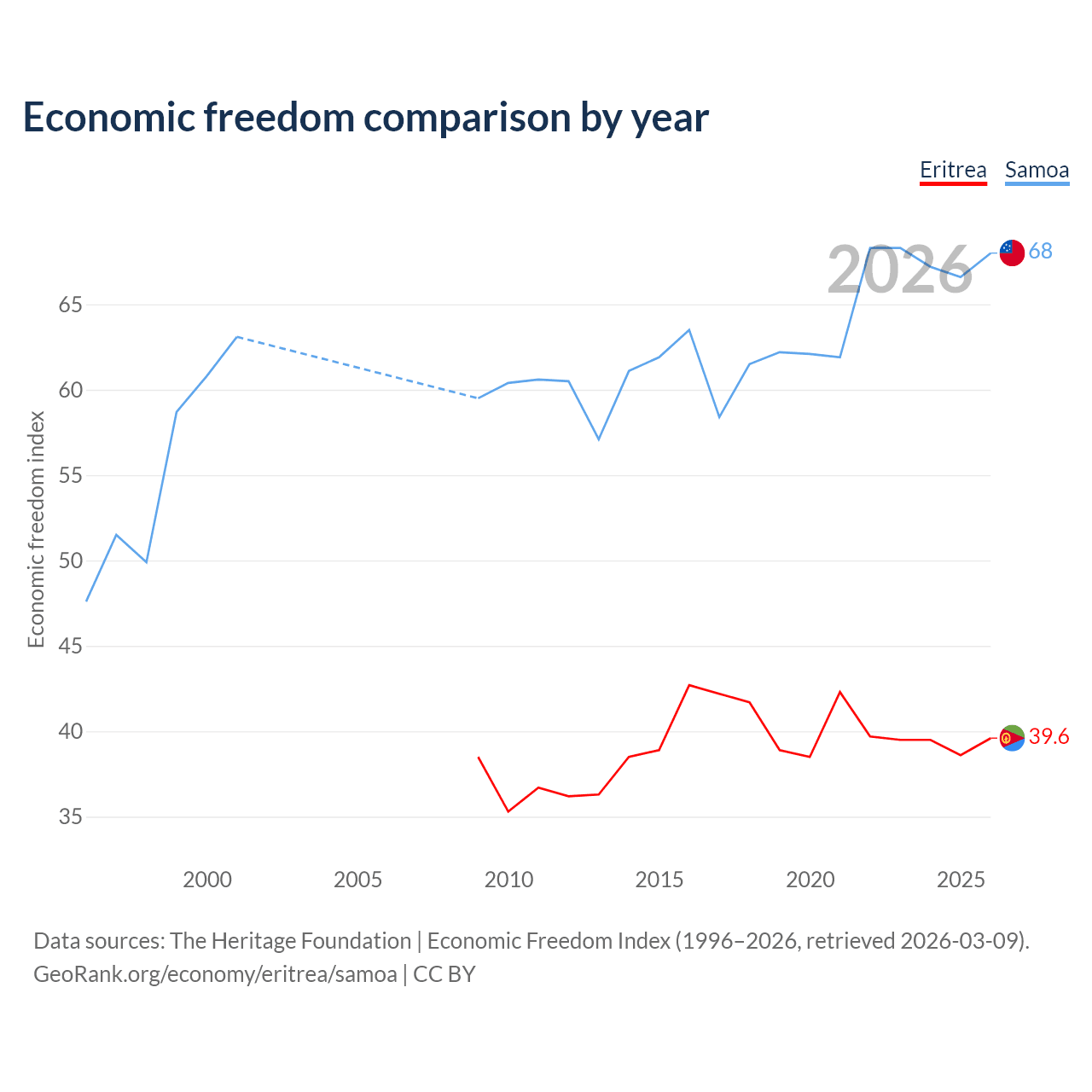 The Economic Freedom Index for Eritrea is 39.6, ranking 188/197, compared to 68 for Samoa, ranking 52/197. The chart above displays a comparison of annual changes in economic freedom indexes.