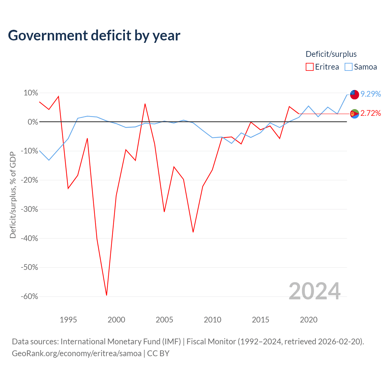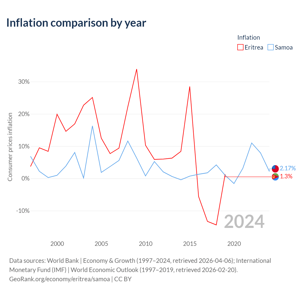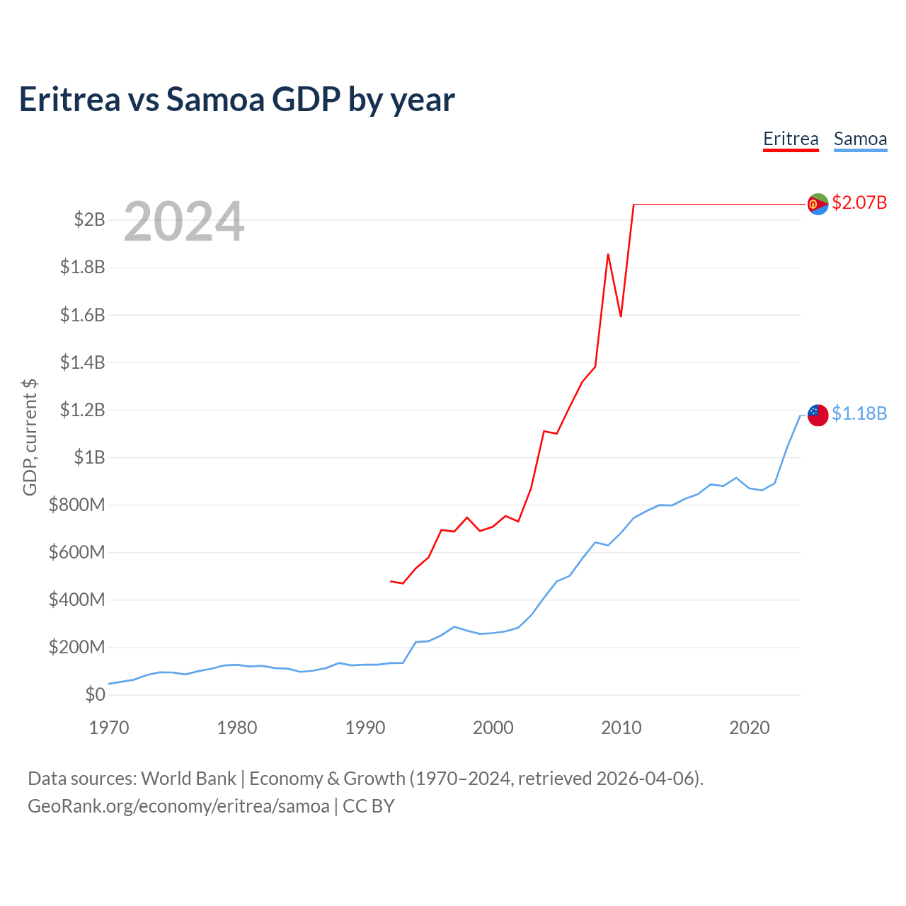 Eritrea has a GDP of $2.07B compared to $1.18B for Samoa, ranking 179/197 and 185/197 by economy size, respectively.