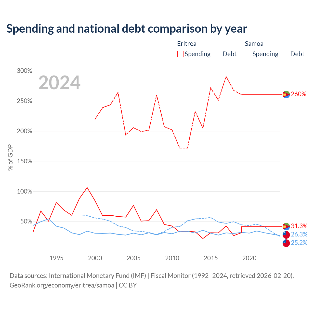 Eritrea has $3.54B in government debt (260.4% of GDP), compared to $296M (25.2% of GDP) in Samoa.