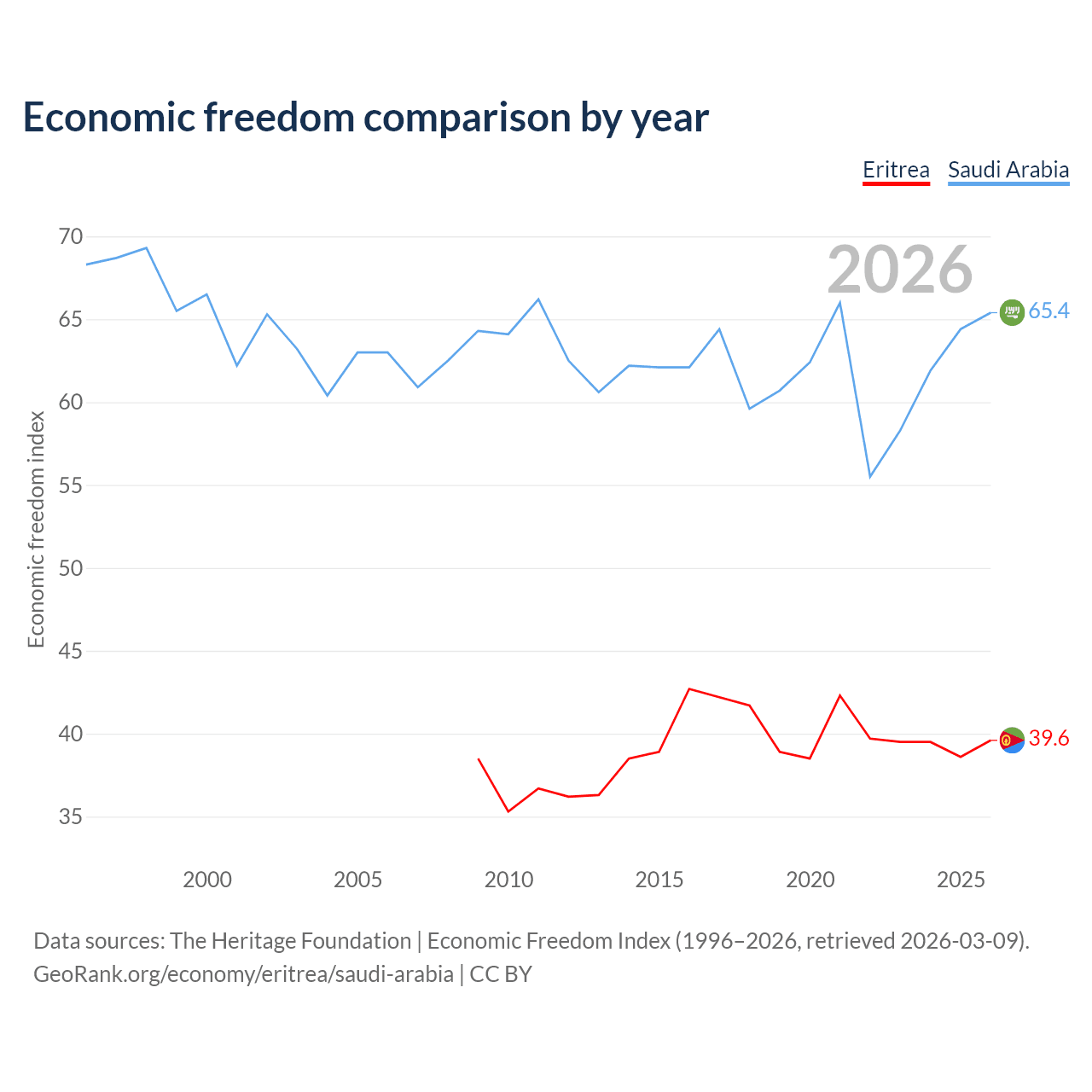 The Economic Freedom Index for Eritrea is 39.6, ranking 188/197, compared to 65.4 for Saudi Arabia, ranking 65/197. The chart above displays a comparison of annual changes in economic freedom indexes.