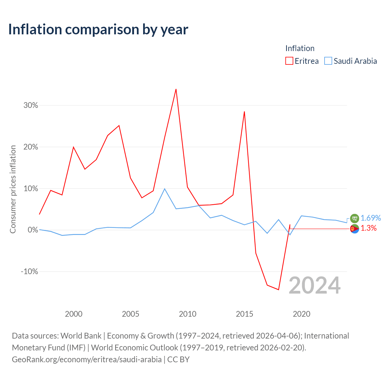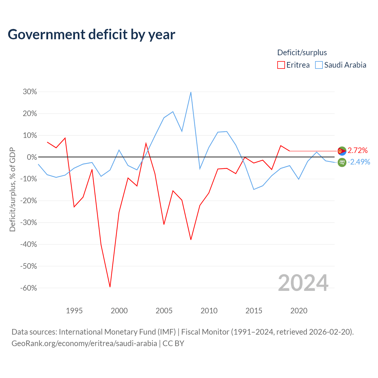 Eritrea has a GDP of $2.07B compared to $1.24T for Saudi Arabia, ranking 179/197 and 18/197 by economy size, respectively.