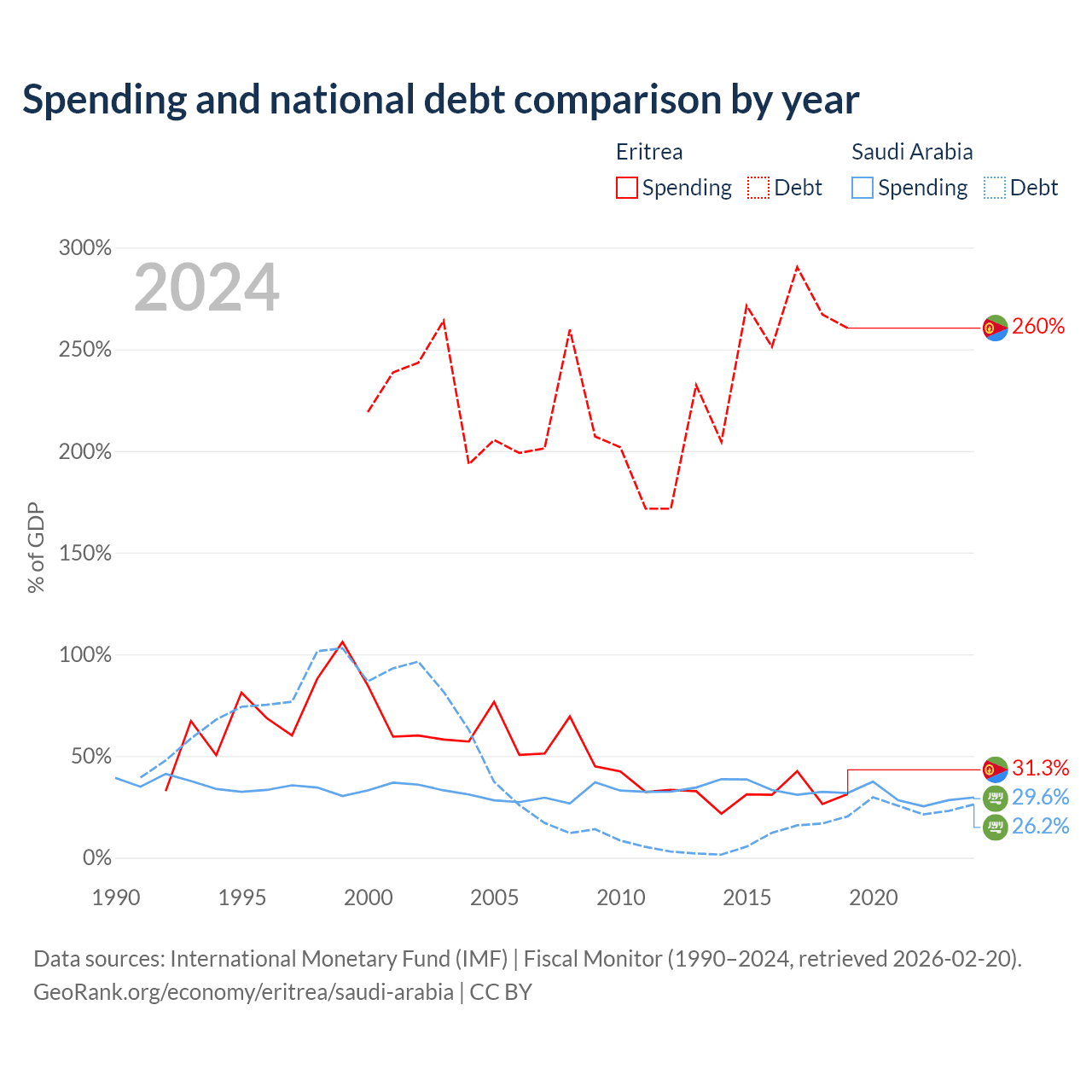 Eritrea has $3.54B in government debt (260.4% of GDP), compared to $324B (26.2% of GDP) in Saudi Arabia.