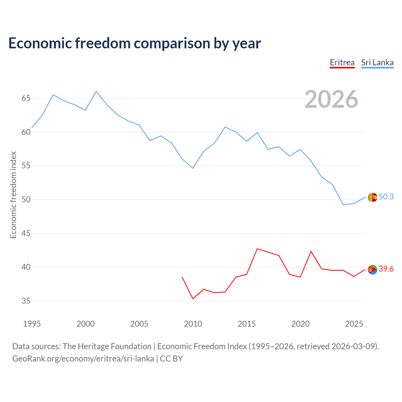 The Economic Freedom Index for Eritrea is 39.6, ranking 188/197, compared to 50.3 for Sri Lanka, ranking 162/197. The chart above displays a comparison of annual changes in economic freedom indexes.