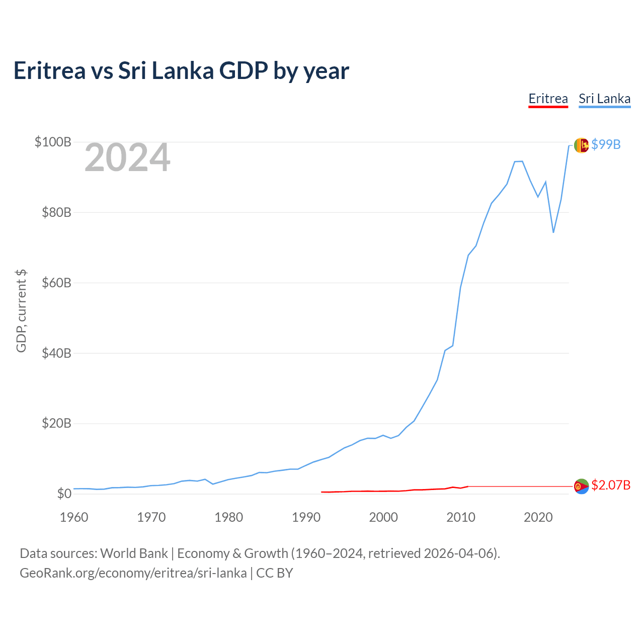 Eritrea has a GDP of $2.07B compared to $99B for Sri Lanka, ranking 179/197 and 72/197 by economy size, respectively.
