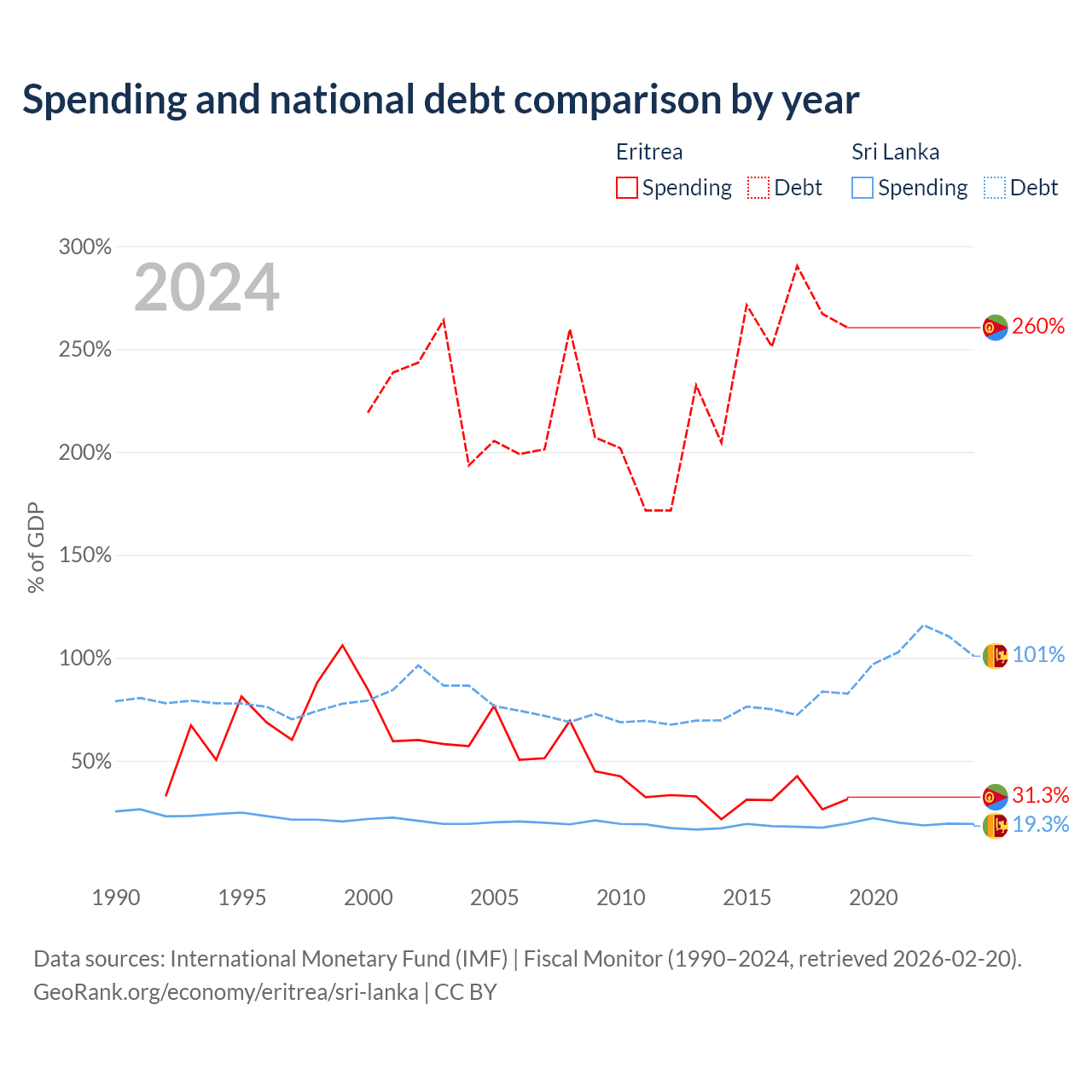 Eritrea has $3.54B in government debt (260.4% of GDP), compared to $99.8B (100.8% of GDP) in Sri Lanka.
