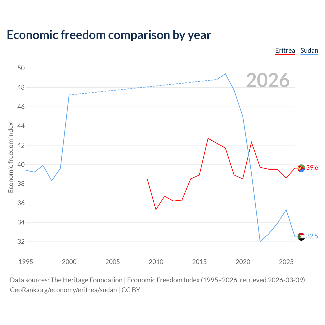 The Economic Freedom Index for Eritrea is 39.6, ranking 188/197, compared to 32.5 for Sudan, ranking 191/197. The chart above displays a comparison of annual changes in economic freedom indexes.