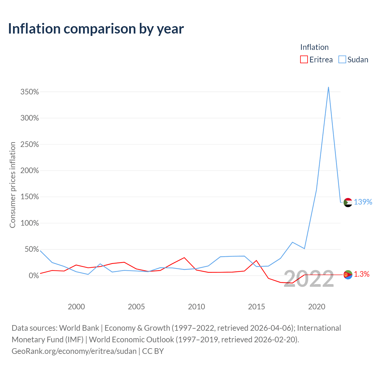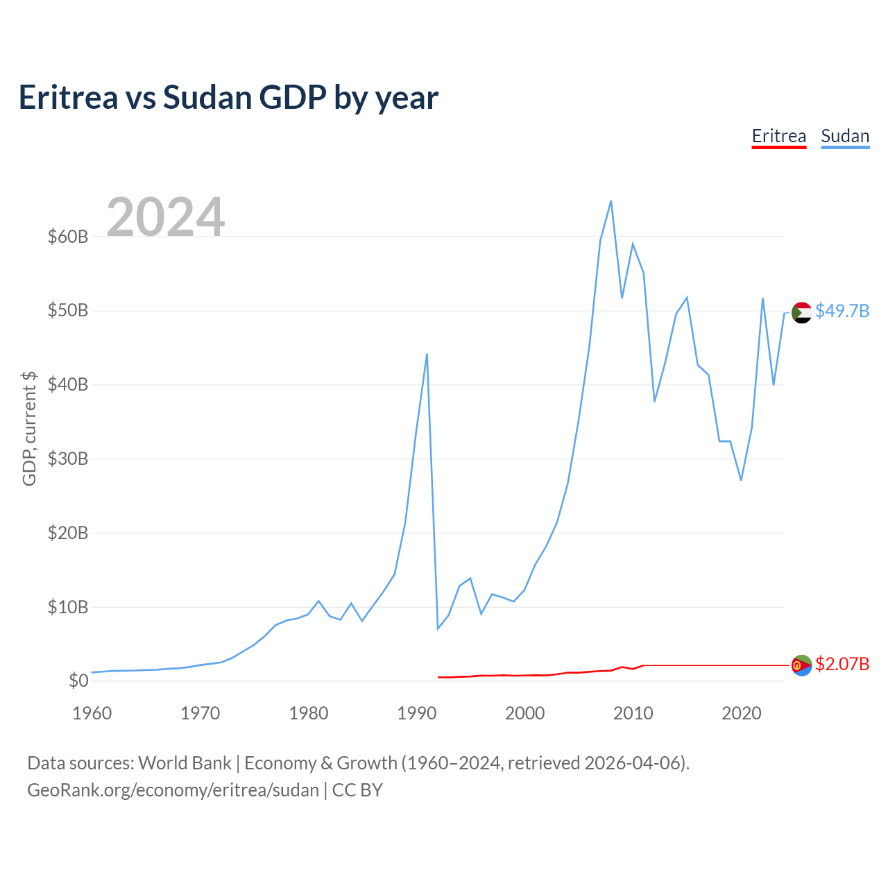 Eritrea has a GDP of $2.07B compared to $49.7B for Sudan, ranking 179/197 and 94/197 by economy size, respectively.