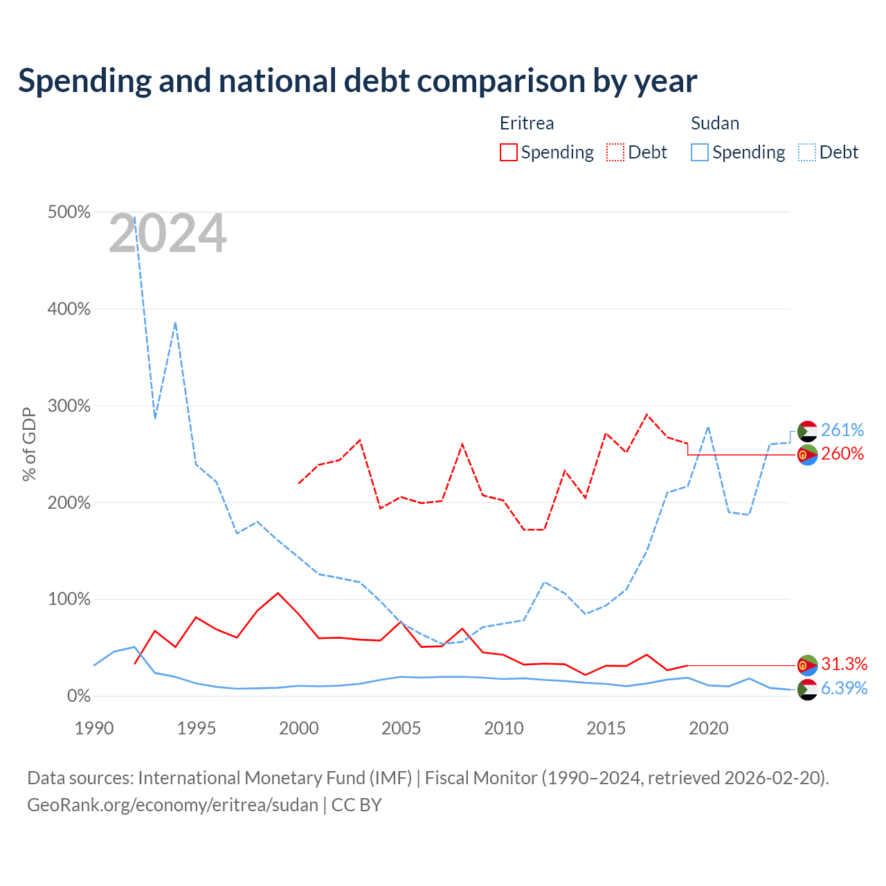 Eritrea has $3.54B in government debt (260.4% of GDP), compared to $130B (261.4% of GDP) in Sudan.