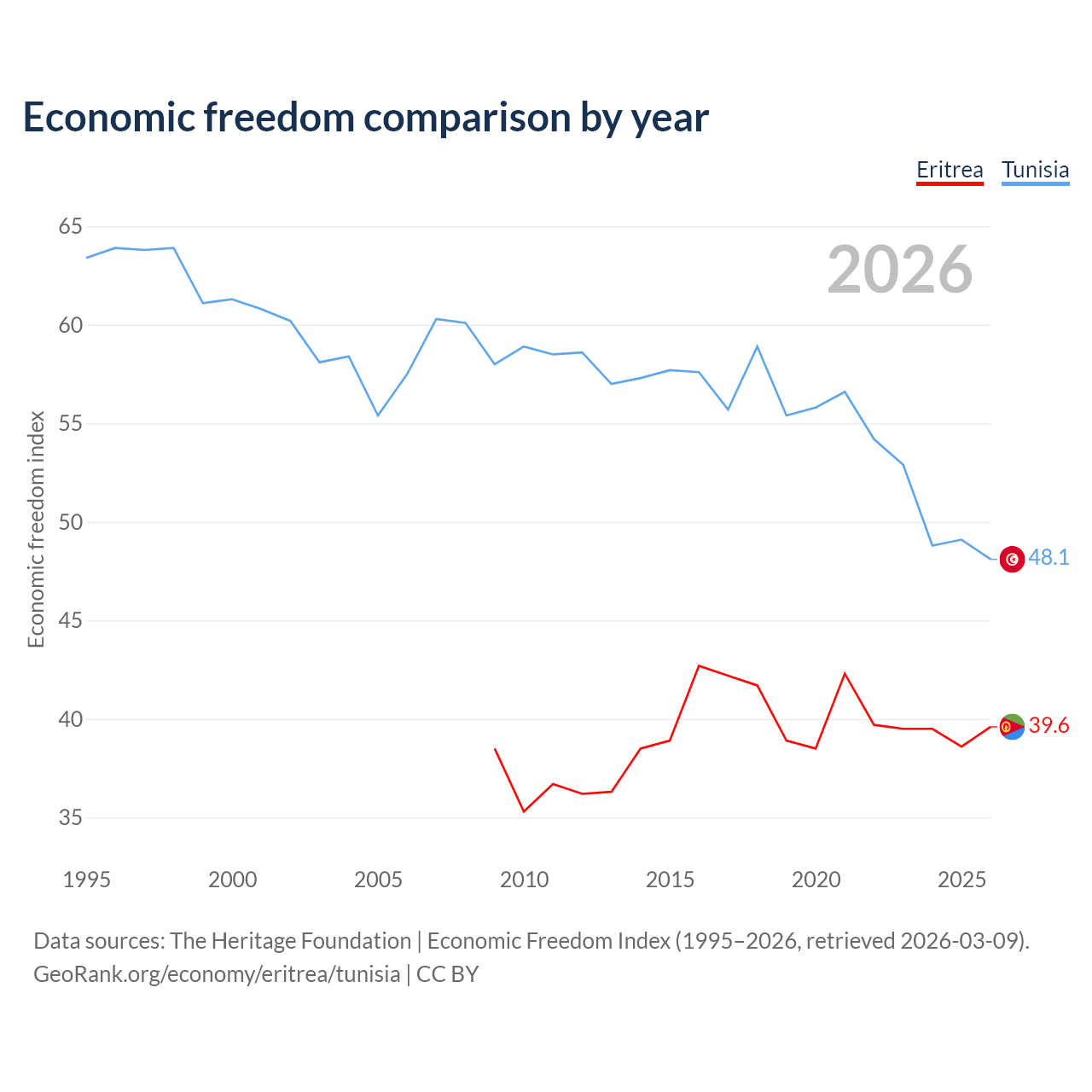 The Economic Freedom Index for Eritrea is 39.6, ranking 188/197, compared to 48.1 for Tunisia, ranking 172/197. The chart above displays a comparison of annual changes in economic freedom indexes.