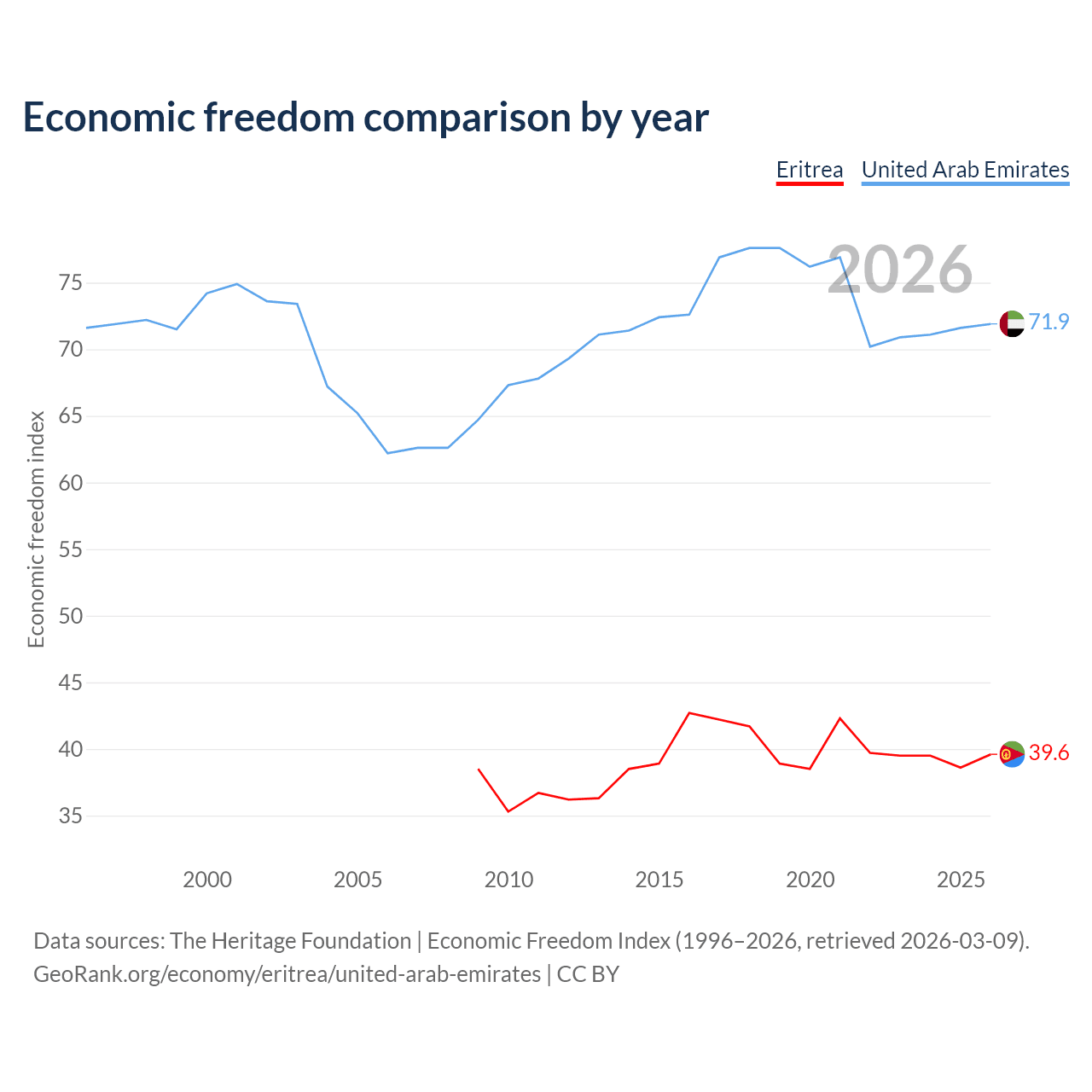 The Economic Freedom Index for Eritrea is 39.6, ranking 188/197, compared to 71.9 for the United Arab Emirates, ranking 29/197. The chart above displays a comparison of annual changes in economic freedom indexes.