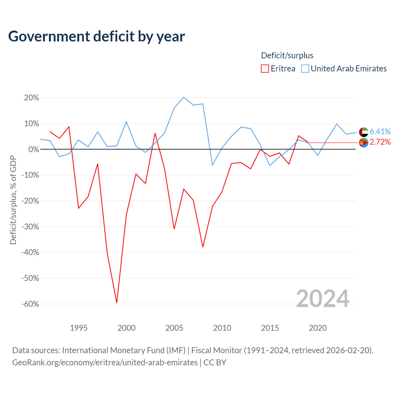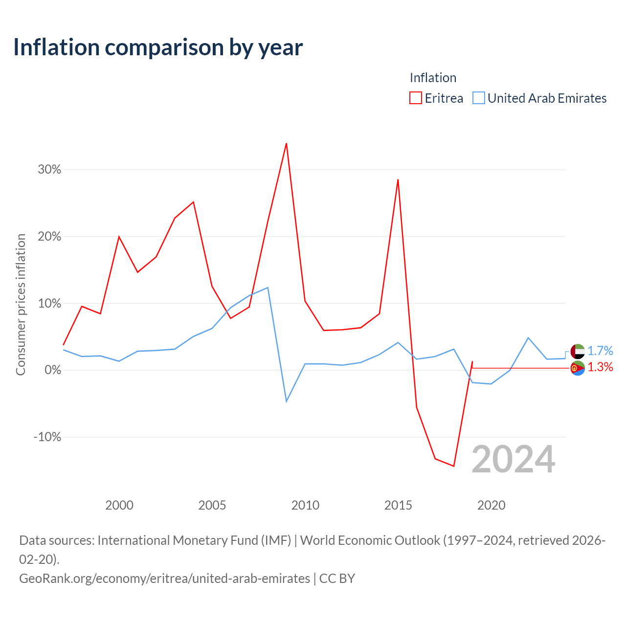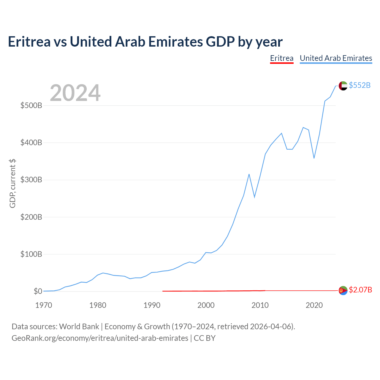 Eritrea has a GDP of $2.07B compared to $552B for the United Arab Emirates, ranking 179/197 and 27/197 by economy size, respectively.