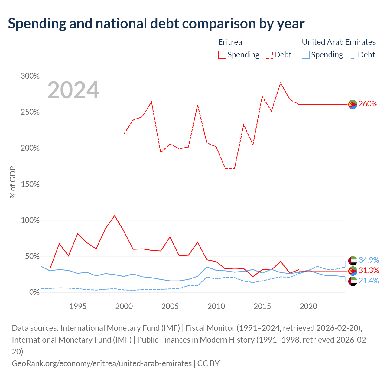 Eritrea has $3.54B in government debt (260.4% of GDP), compared to $193B (34.9% of GDP) in the United Arab Emirates.