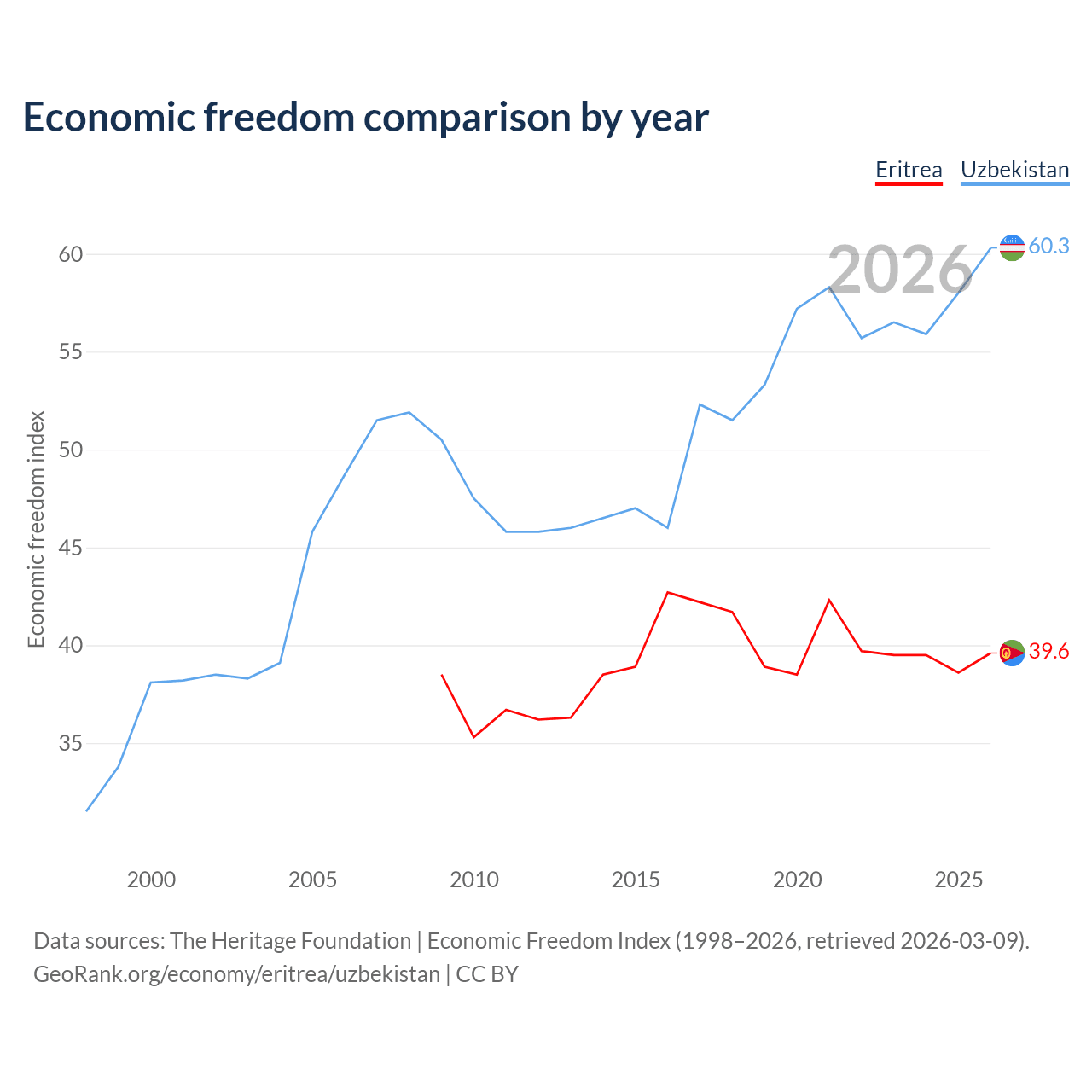 The Economic Freedom Index for Eritrea is 39.6, ranking 188/197, compared to 60.3 for Uzbekistan, ranking 94/197. The chart above displays a comparison of annual changes in economic freedom indexes.