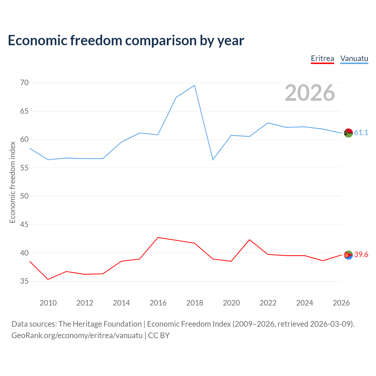 The Economic Freedom Index for Eritrea is 39.6, ranking 188/197, compared to 61.1 for Vanuatu, ranking 92/197. The chart above displays a comparison of annual changes in economic freedom indexes.