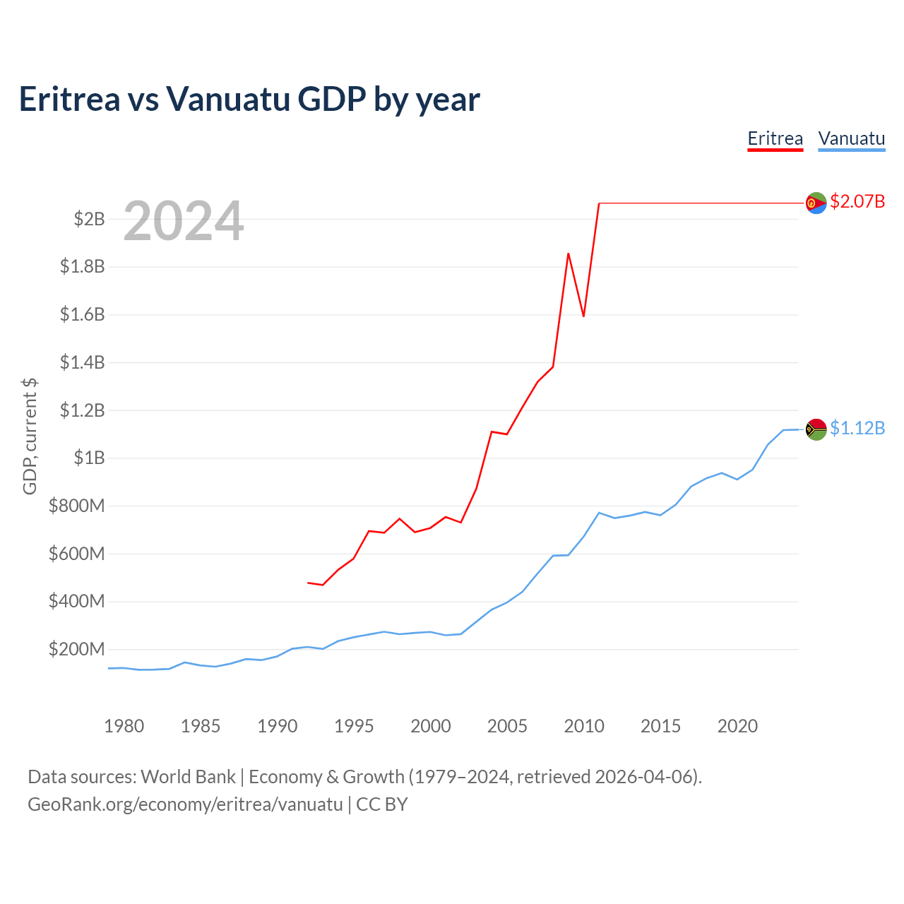 Eritrea has a GDP of $2.07B compared to $1.12B for Vanuatu, ranking 179/197 and 188/197 by economy size, respectively.
