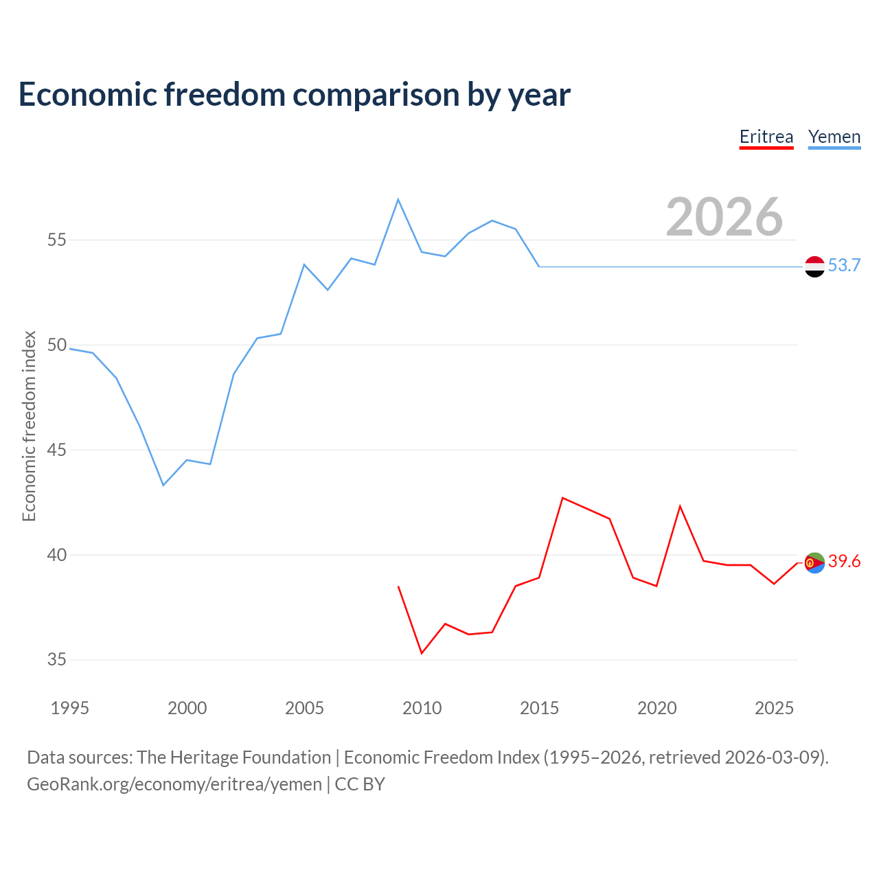 The Economic Freedom Index for Eritrea is 39.6, ranking 188/197, compared to 53.7 for Yemen, ranking 138/197. The chart above displays a comparison of annual changes in economic freedom indexes.