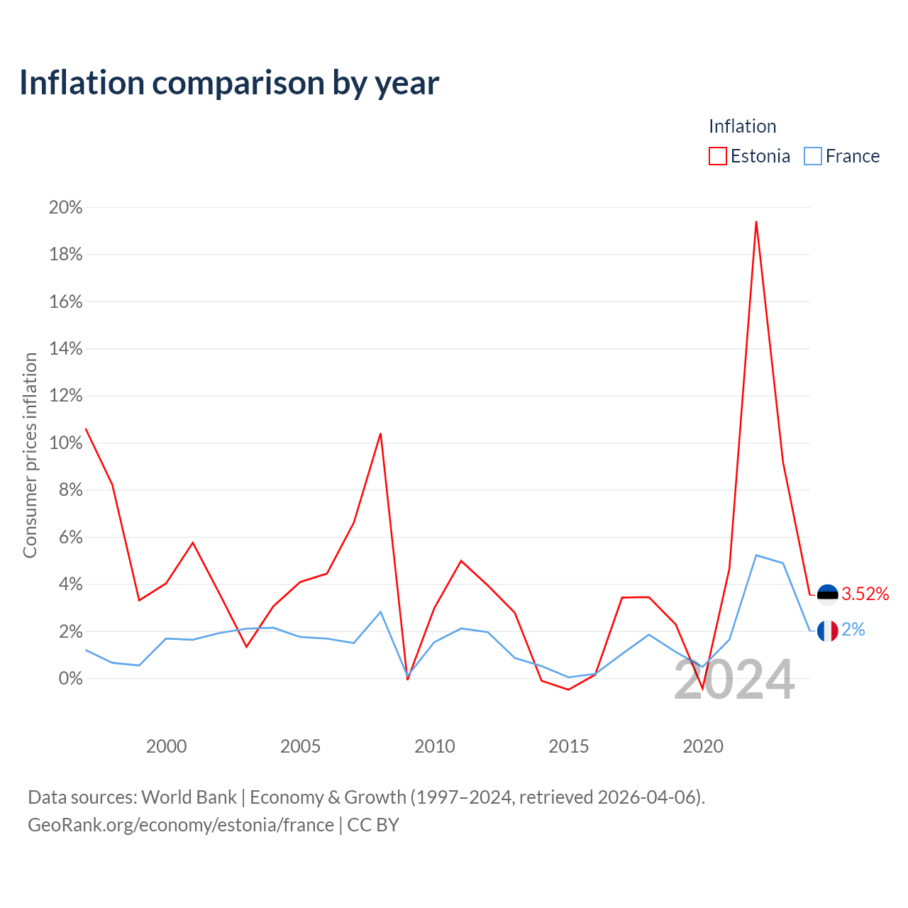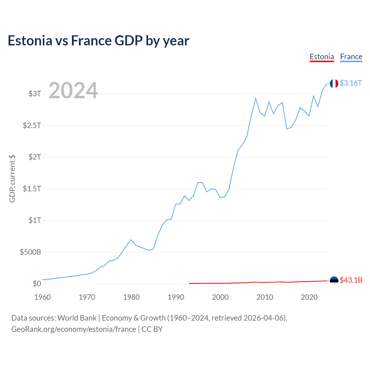 Estonia has a GDP of $43.1B compared to $3.16T for France, ranking 100/197 and 7/197 by economy size, respectively.