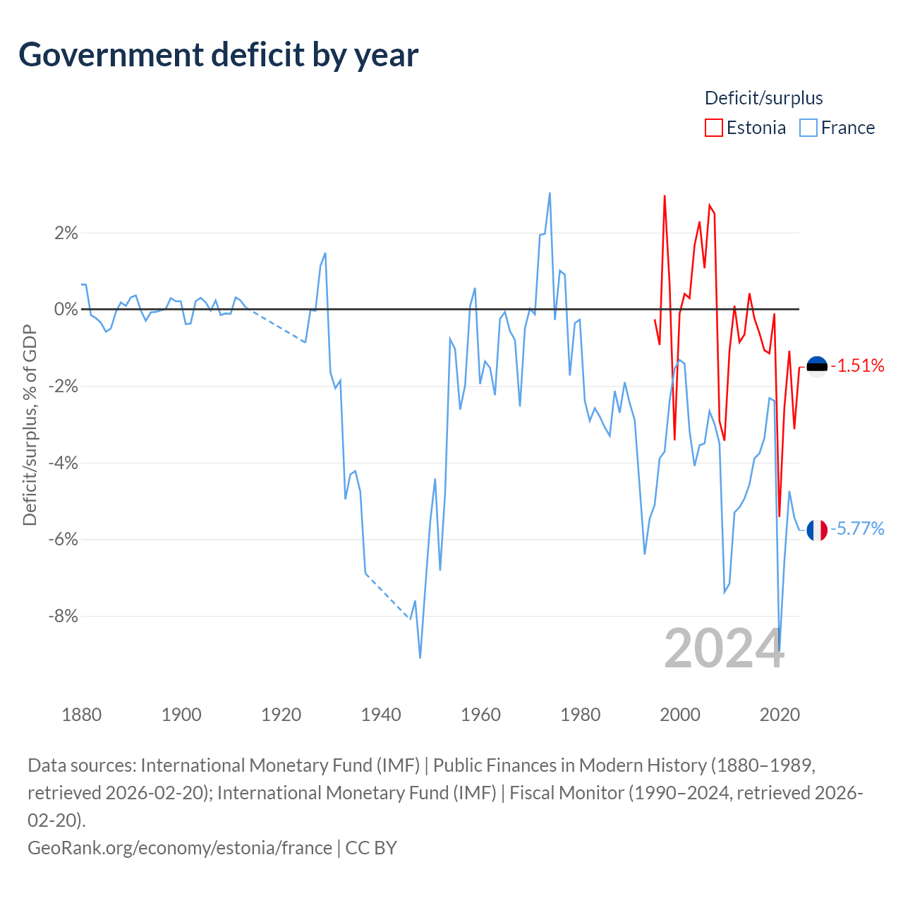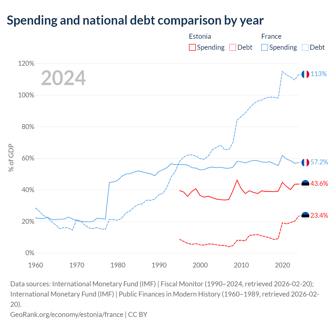 Estonia has $10.1B in government debt (23.4% of GDP), compared to $3.58T (113.1% of GDP) in France.