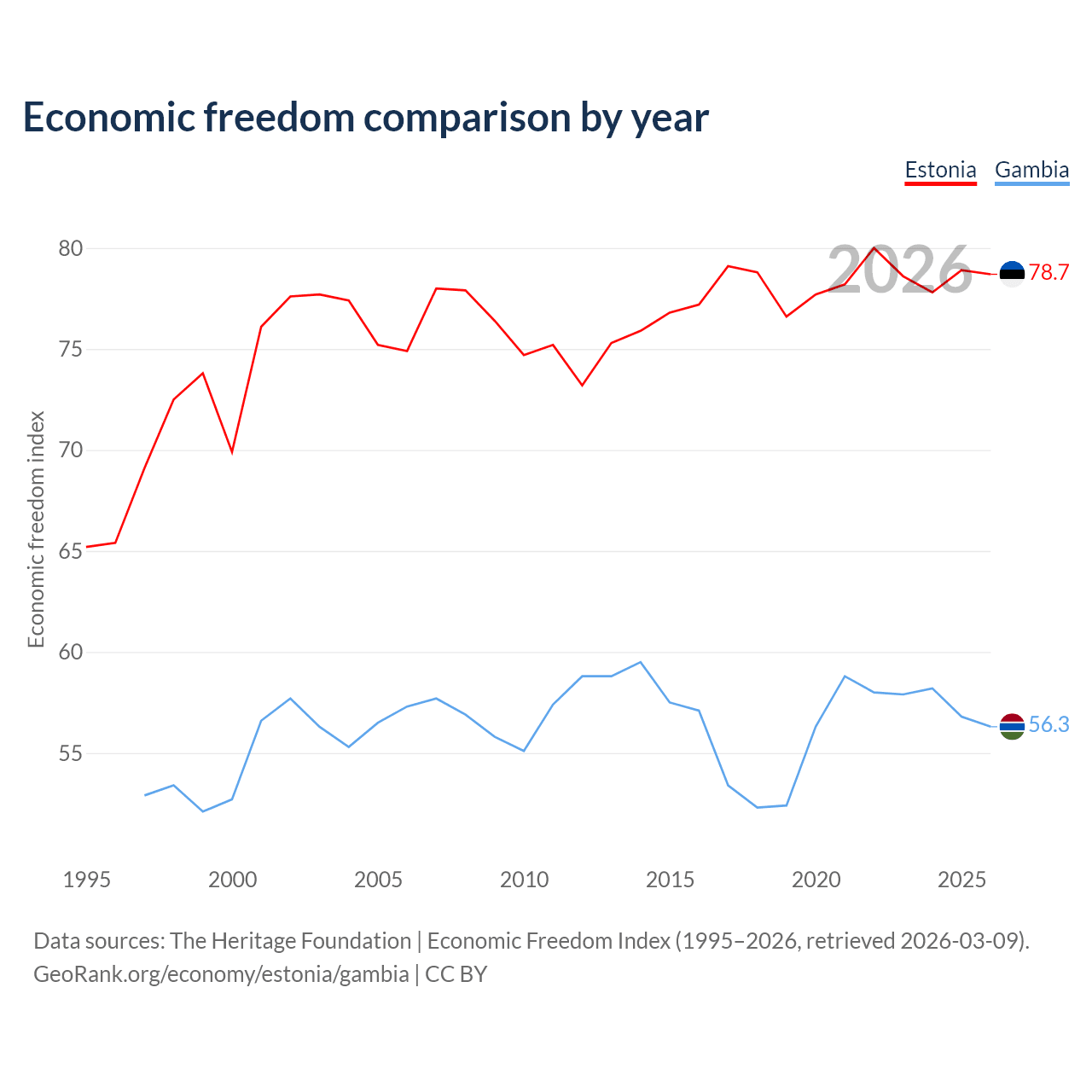 The Economic Freedom Index for Estonia is 78.7, ranking 10/197, compared to 56.3 for the Gambia, ranking 123/197. The chart above displays a comparison of annual changes in economic freedom indexes.