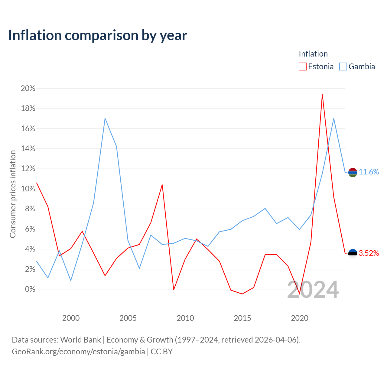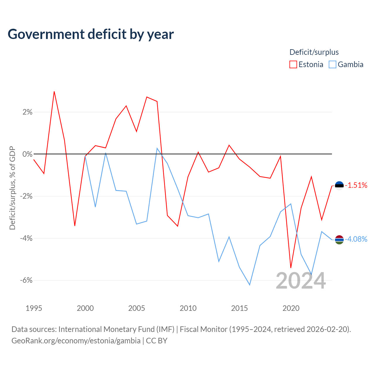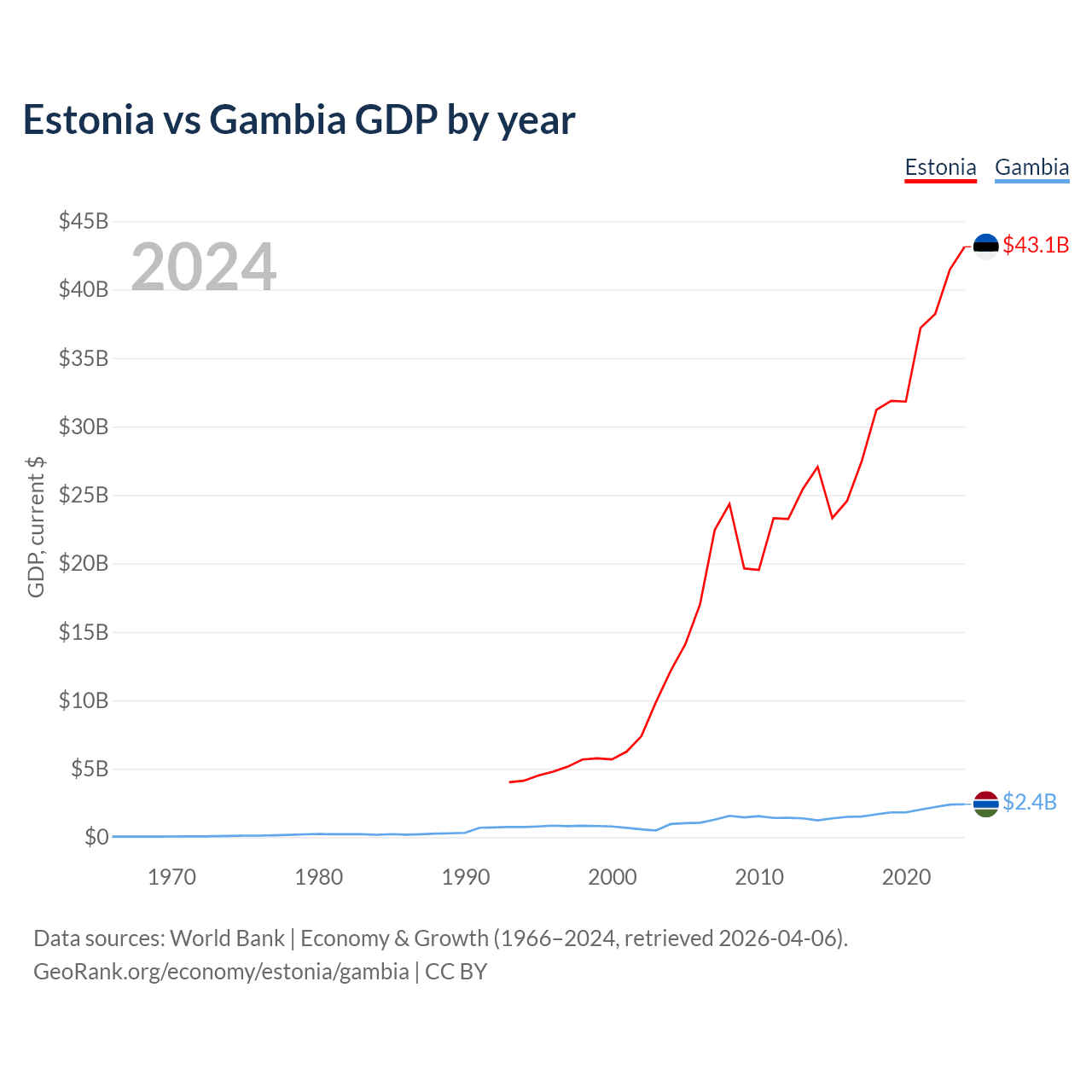 Estonia has a GDP of $43.1B compared to $2.4B for the Gambia, ranking 100/197 and 174/197 by economy size, respectively.