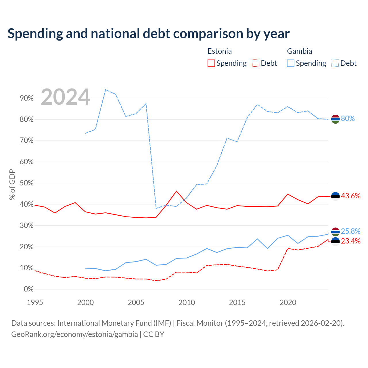 Estonia has $10.1B in government debt (23.4% of GDP), compared to $1.92B (80% of GDP) in the Gambia.