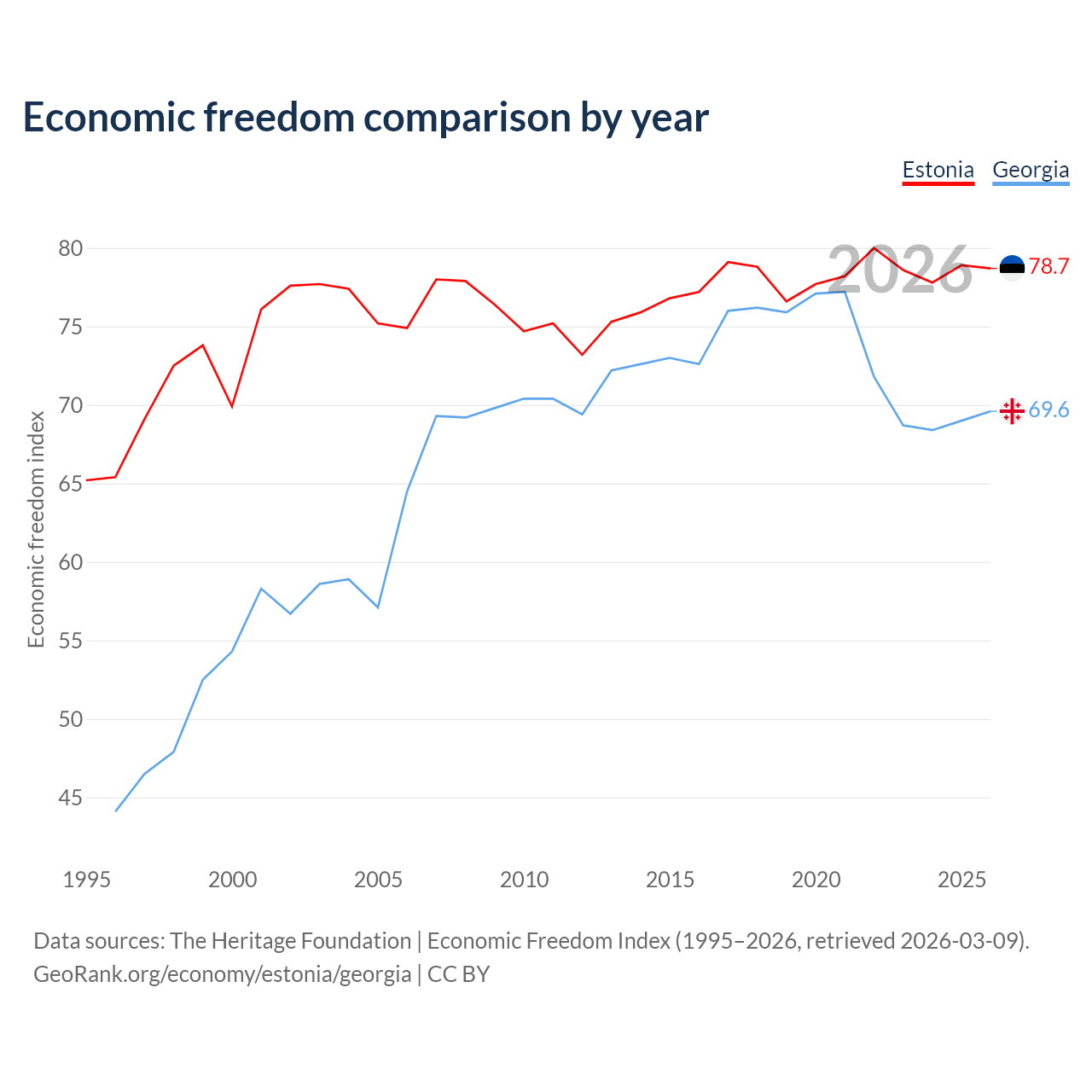 The Economic Freedom Index for Estonia is 78.7, ranking 10/197, compared to 69.6 for Georgia, ranking 41/197. The chart above displays a comparison of annual changes in economic freedom indexes.
