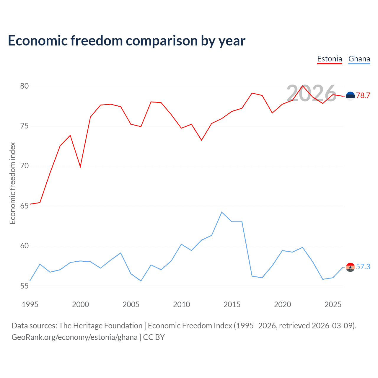 The Economic Freedom Index for Estonia is 78.7, ranking 10/197, compared to 57.3 for Ghana, ranking 118/197. The chart above displays a comparison of annual changes in economic freedom indexes.