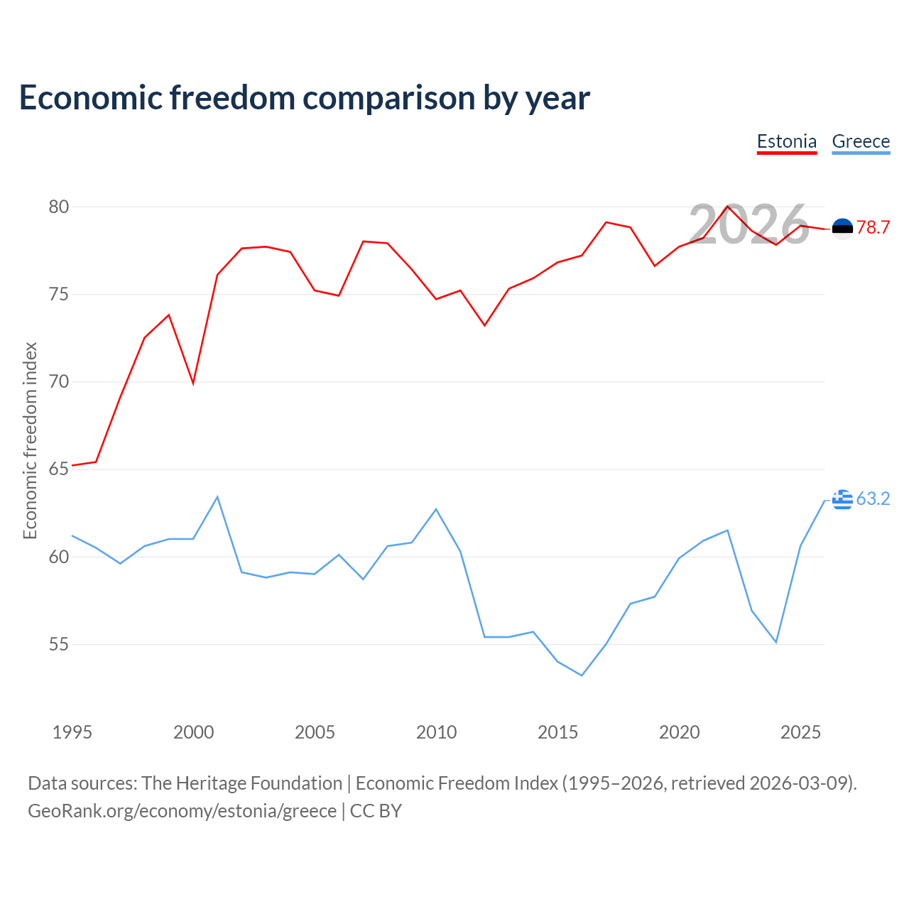 The Economic Freedom Index for Estonia is 78.7, ranking 10/197, compared to 63.2 for Greece, ranking 82/197. The chart above displays a comparison of annual changes in economic freedom indexes.