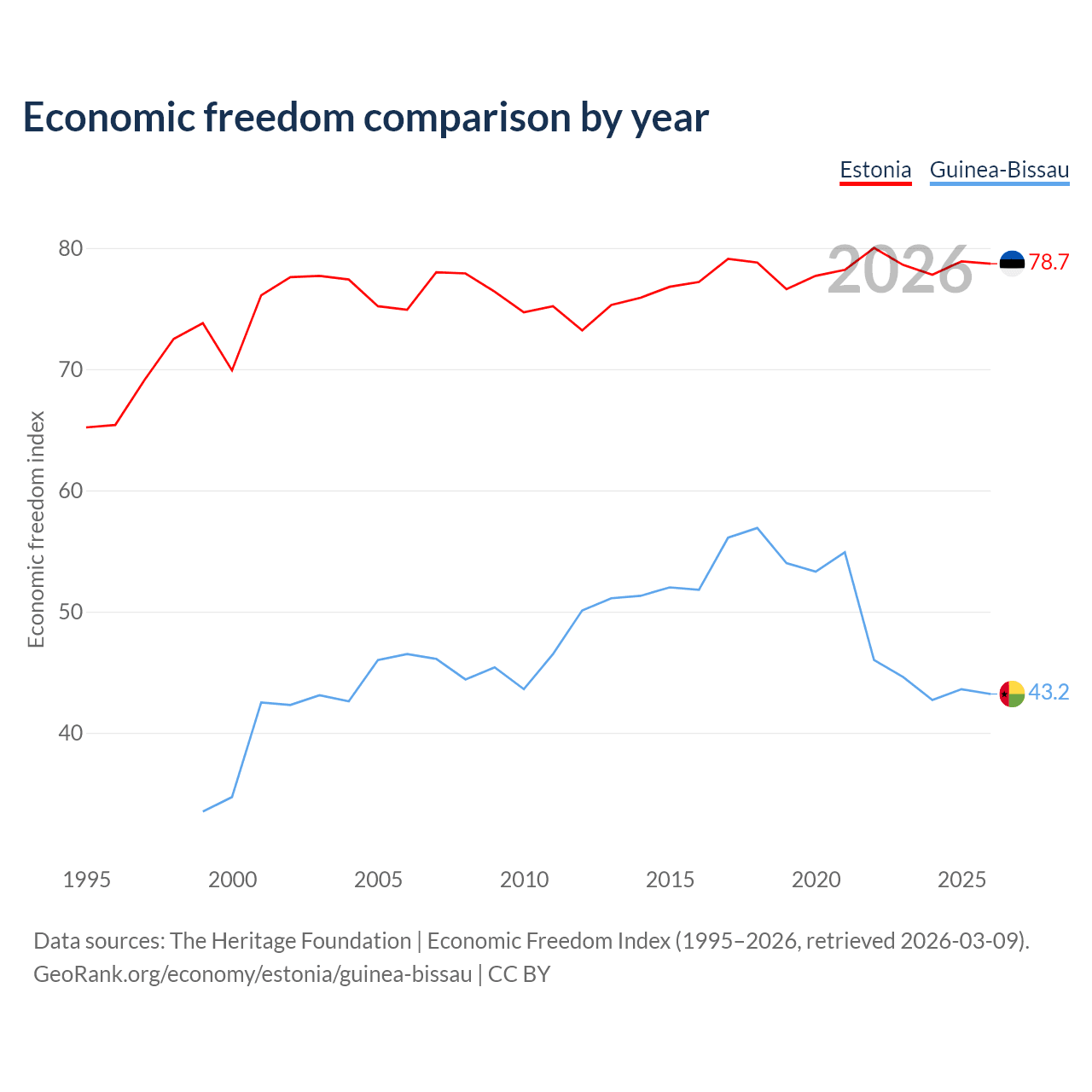 The Economic Freedom Index for Estonia is 78.7, ranking 10/197, compared to 43.2 for Guinea-Bissau, ranking 181/197. The chart above displays a comparison of annual changes in economic freedom indexes.