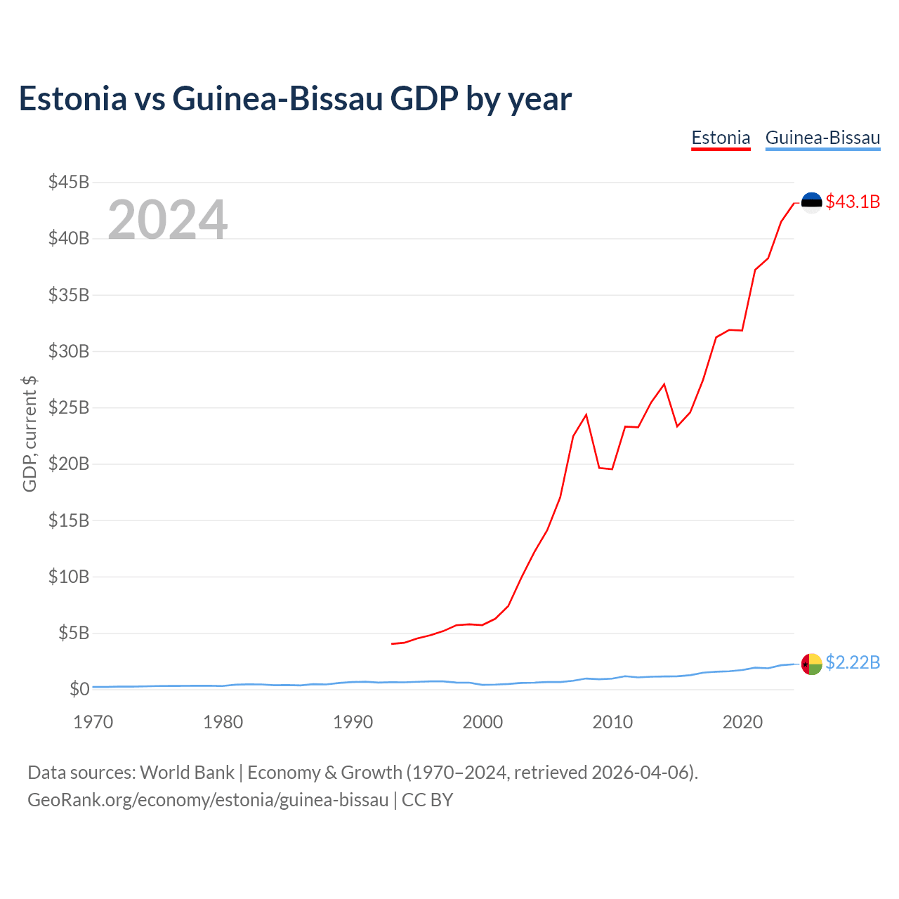 Estonia has a GDP of $43.1B compared to $2.22B for Guinea-Bissau, ranking 100/197 and 176/197 by economy size, respectively.