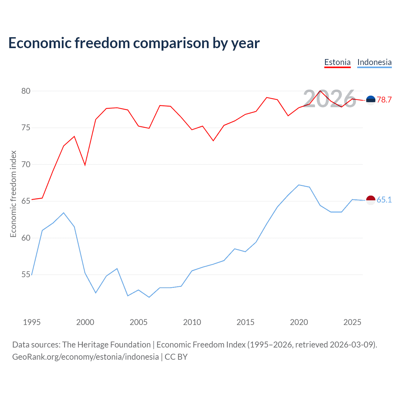 The Economic Freedom Index for Estonia is 78.7, ranking 10/197, compared to 65.1 for Indonesia, ranking 67/197. The chart above displays a comparison of annual changes in economic freedom indexes.