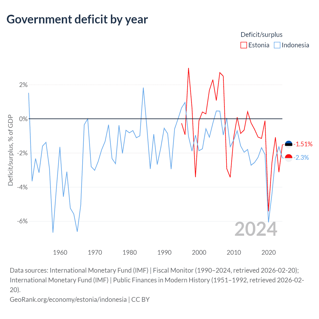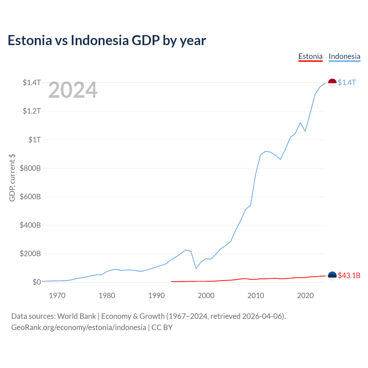 Estonia has a GDP of $43.1B compared to $1.4T for Indonesia, ranking 100/197 and 16/197 by economy size, respectively.
