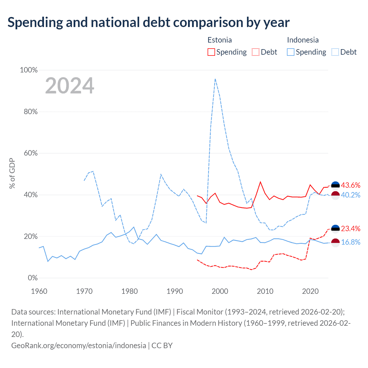 Estonia has $10.1B in government debt (23.4% of GDP), compared to $561B (40.2% of GDP) in Indonesia.