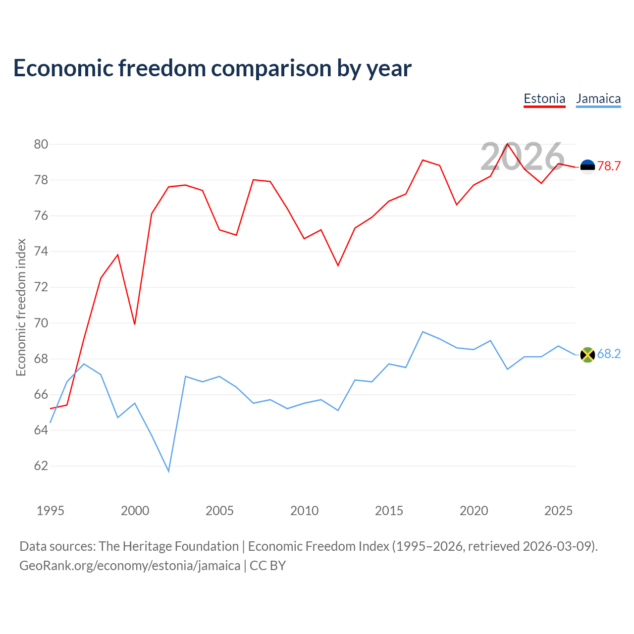 The Economic Freedom Index for Estonia is 78.7, ranking 10/197, compared to 68.2 for Jamaica, ranking 48/197. The chart above displays a comparison of annual changes in economic freedom indexes.
