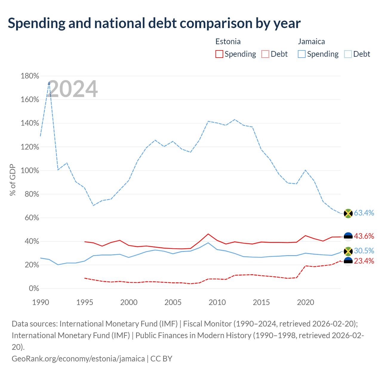 Estonia has $10.1B in government debt (23.4% of GDP), compared to $14B (63.4% of GDP) in Jamaica.