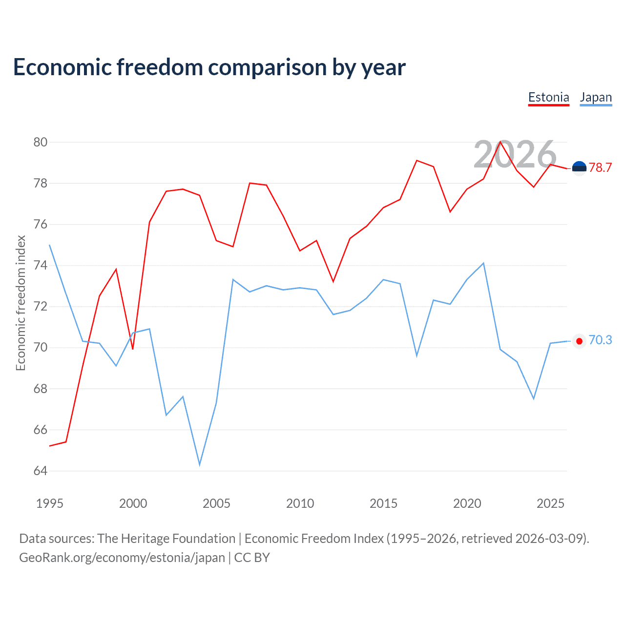The Economic Freedom Index for Estonia is 78.7, ranking 10/197, compared to 70.3 for Japan, ranking 36/197. The chart above displays a comparison of annual changes in economic freedom indexes.