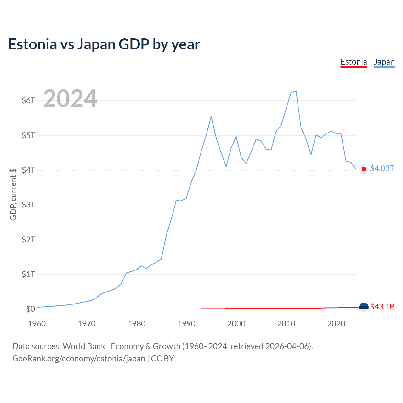 Estonia has a GDP of $43.1B compared to $4.03T for Japan, ranking 100/197 and 4/197 by economy size, respectively.