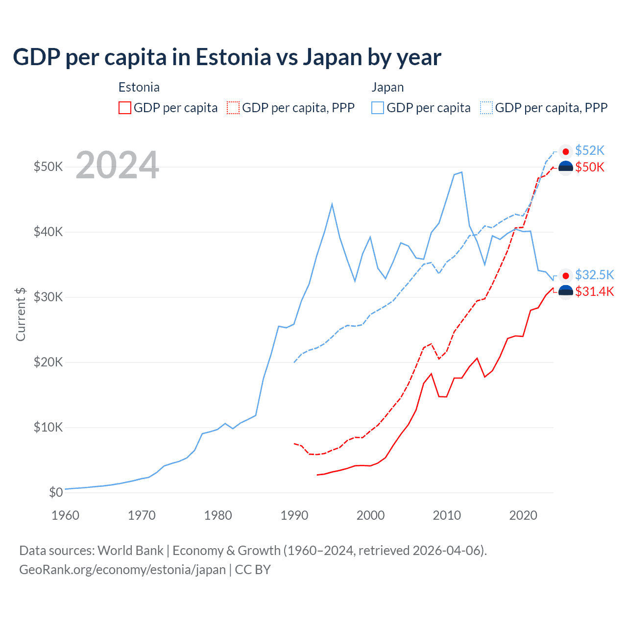 GDP per capita in Estonia vs Japan by year