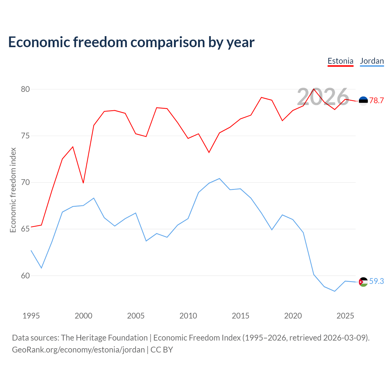 The Economic Freedom Index for Estonia is 78.7, ranking 10/197, compared to 59.3 for Jordan, ranking 104/197. The chart above displays a comparison of annual changes in economic freedom indexes.