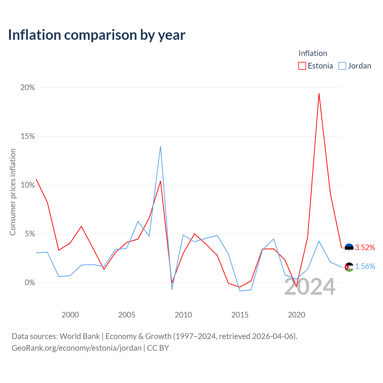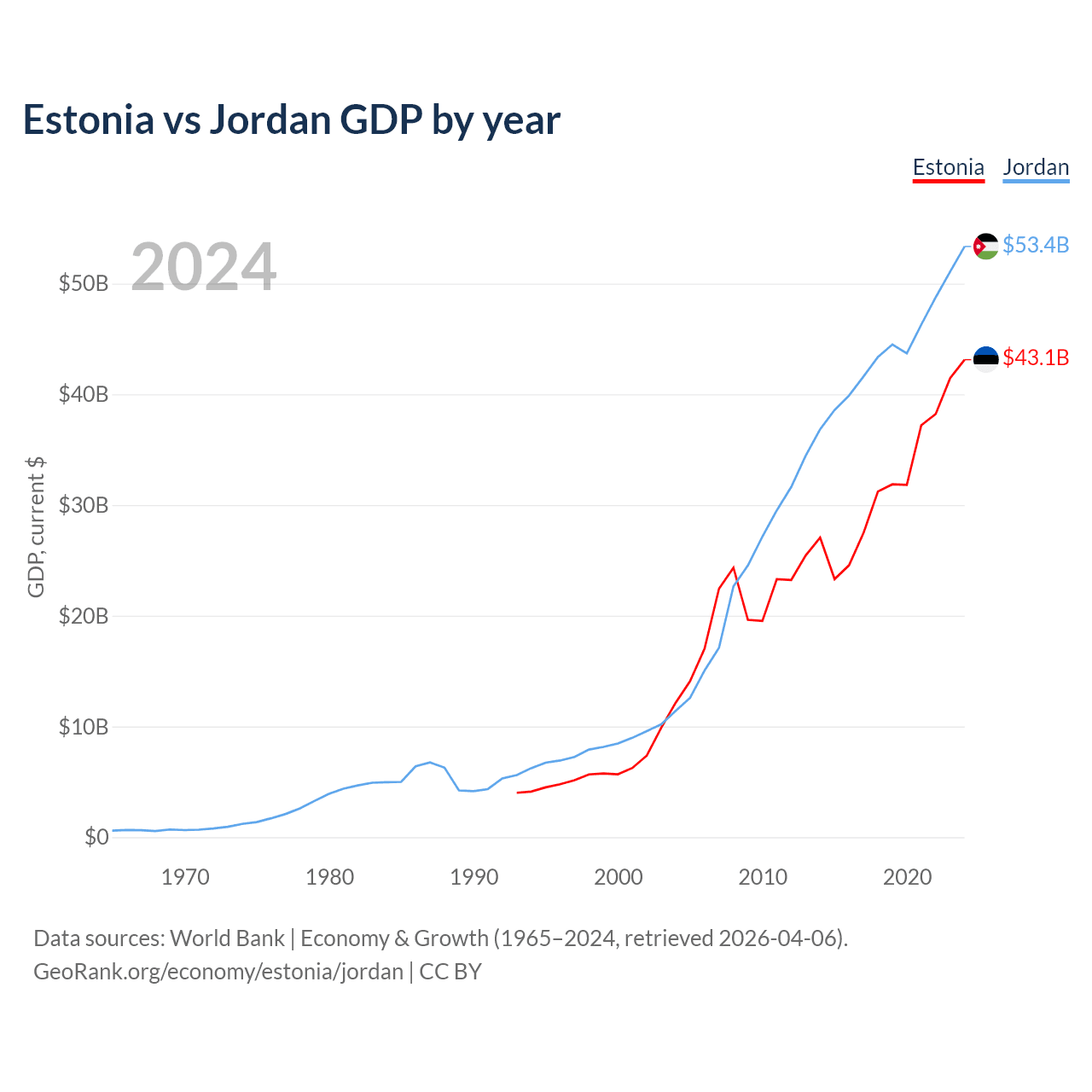 Estonia has a GDP of $43.1B compared to $53.4B for Jordan, ranking 100/197 and 90/197 by economy size, respectively.