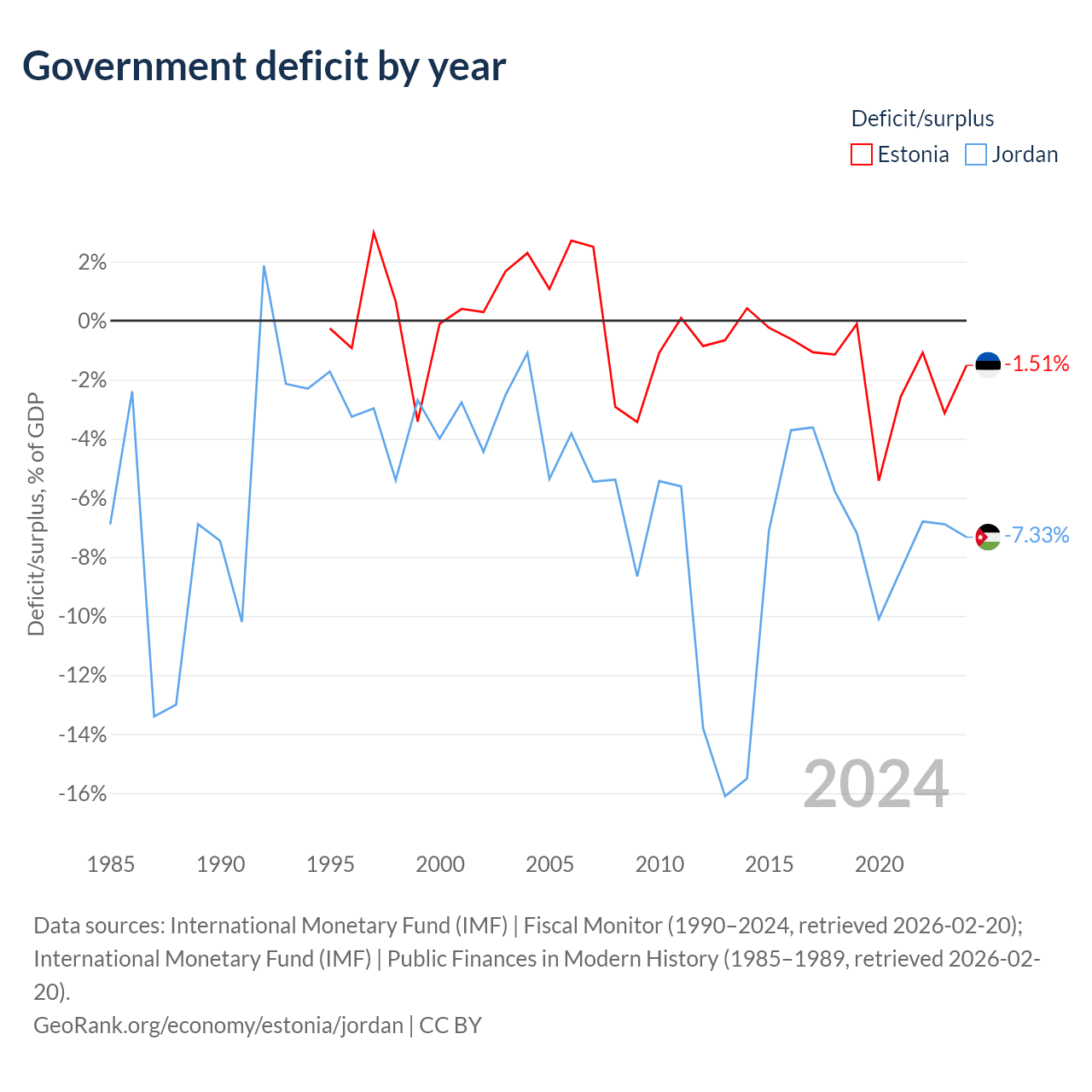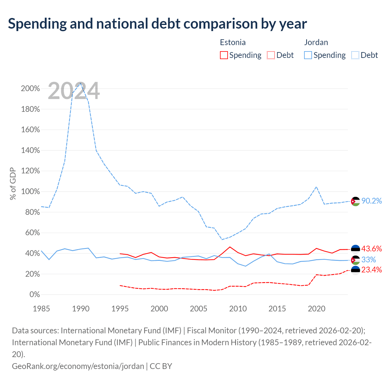 Estonia has $10.1B in government debt (23.4% of GDP), compared to $48.1B (90.2% of GDP) in Jordan.