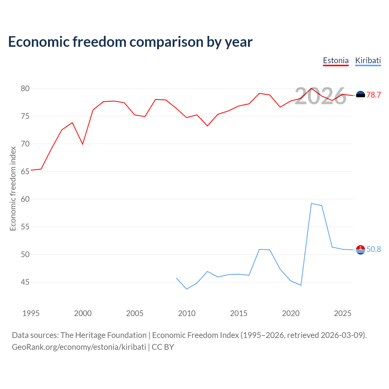The Economic Freedom Index for Estonia is 78.7, ranking 10/197, compared to 50.8 for Kiribati, ranking 158/197. The chart above displays a comparison of annual changes in economic freedom indexes.