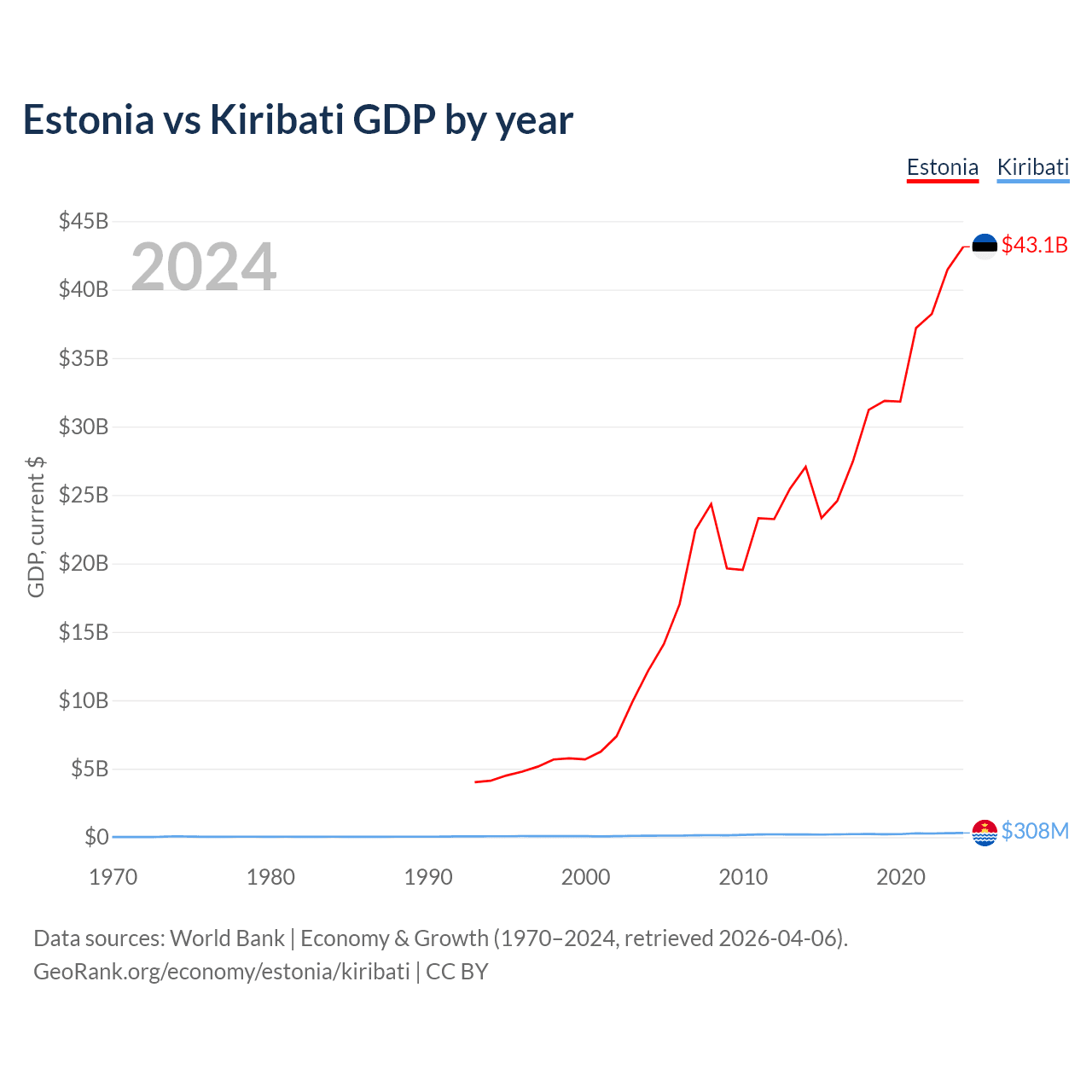 Estonia has a GDP of $43.1B compared to $308M for Kiribati, ranking 100/197 and 192/197 by economy size, respectively.