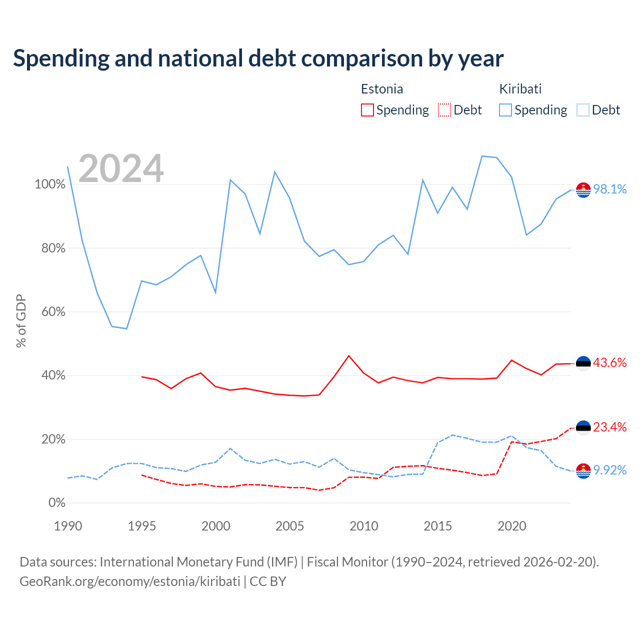 Estonia has $10.1B in government debt (23.4% of GDP), compared to $30.5M (9.92% of GDP) in Kiribati.