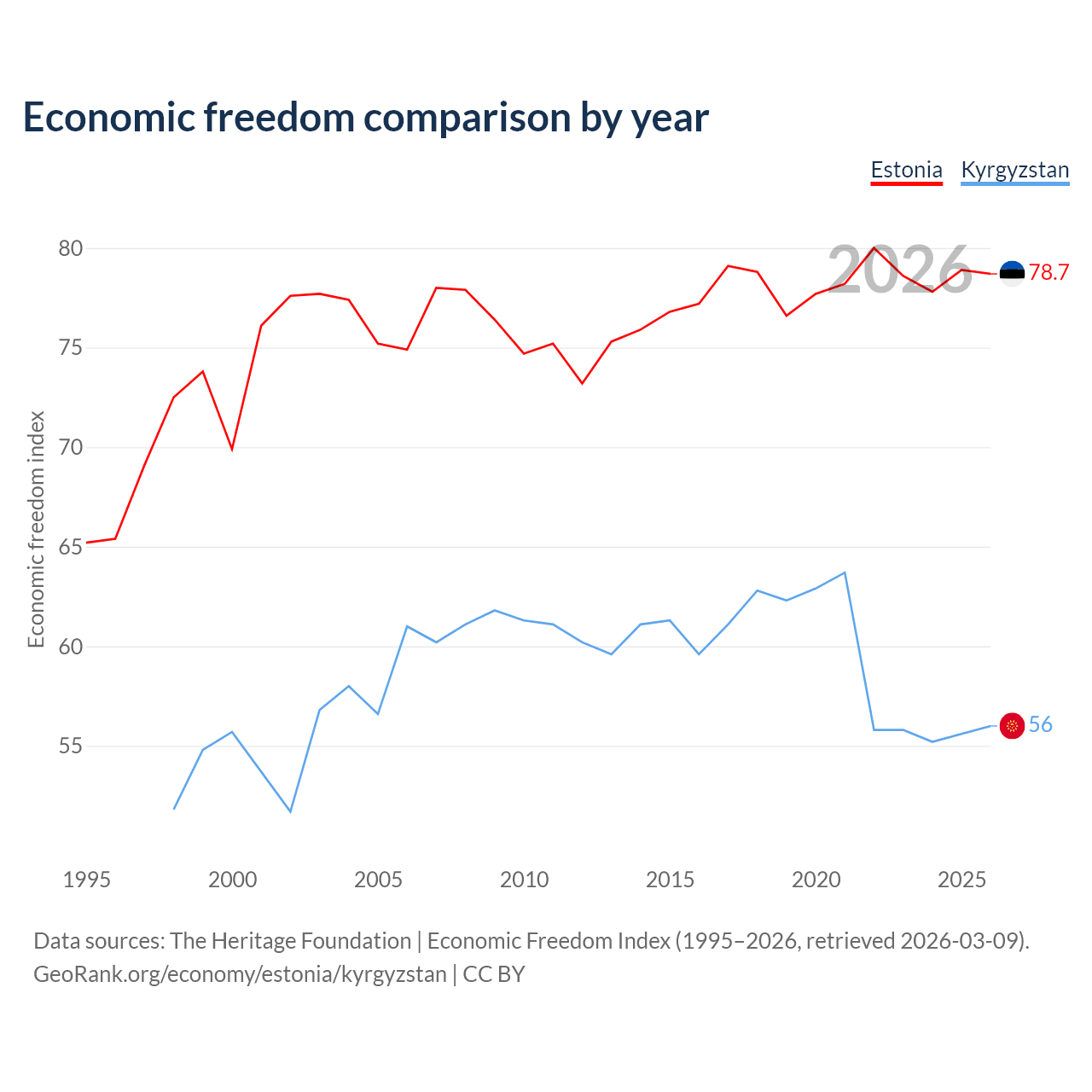 The Economic Freedom Index for Estonia is 78.7, ranking 10/197, compared to 56 for Kyrgyzstan, ranking 126/197. The chart above displays a comparison of annual changes in economic freedom indexes.