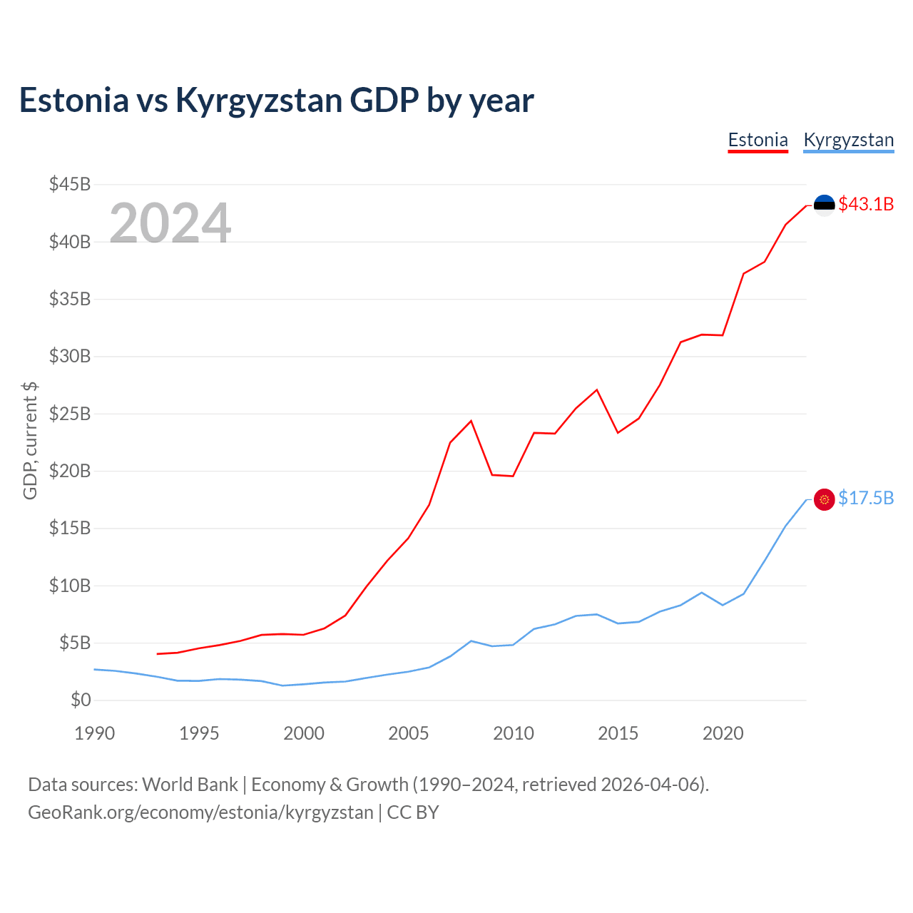 Estonia has a GDP of $43.1B compared to $17.5B for Kyrgyzstan, ranking 100/197 and 135/197 by economy size, respectively.