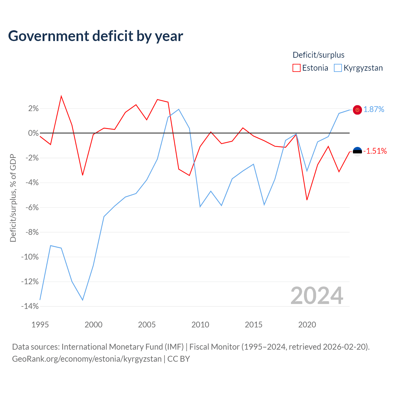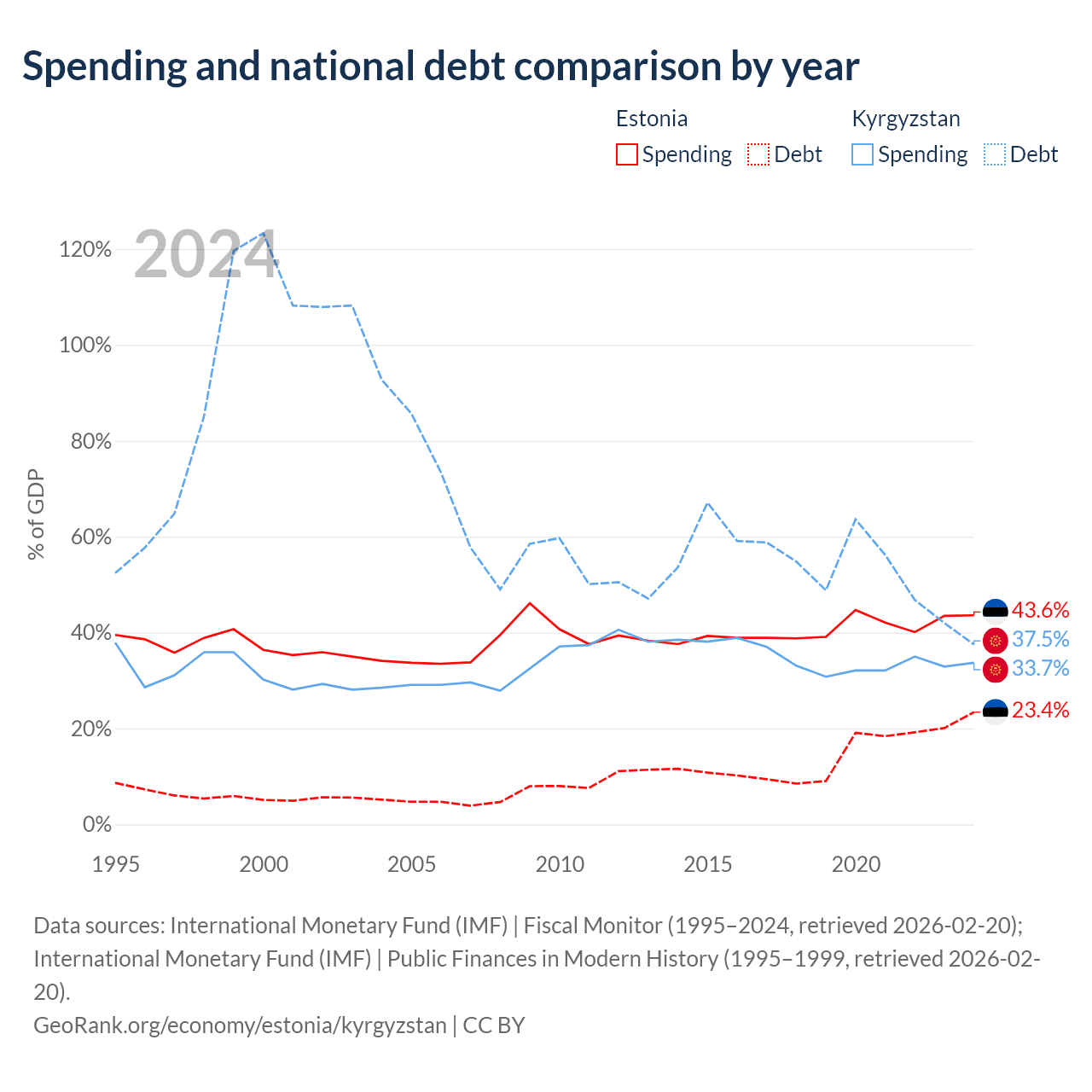 Estonia has $10.1B in government debt (23.4% of GDP), compared to $6.56B (37.5% of GDP) in Kyrgyzstan.